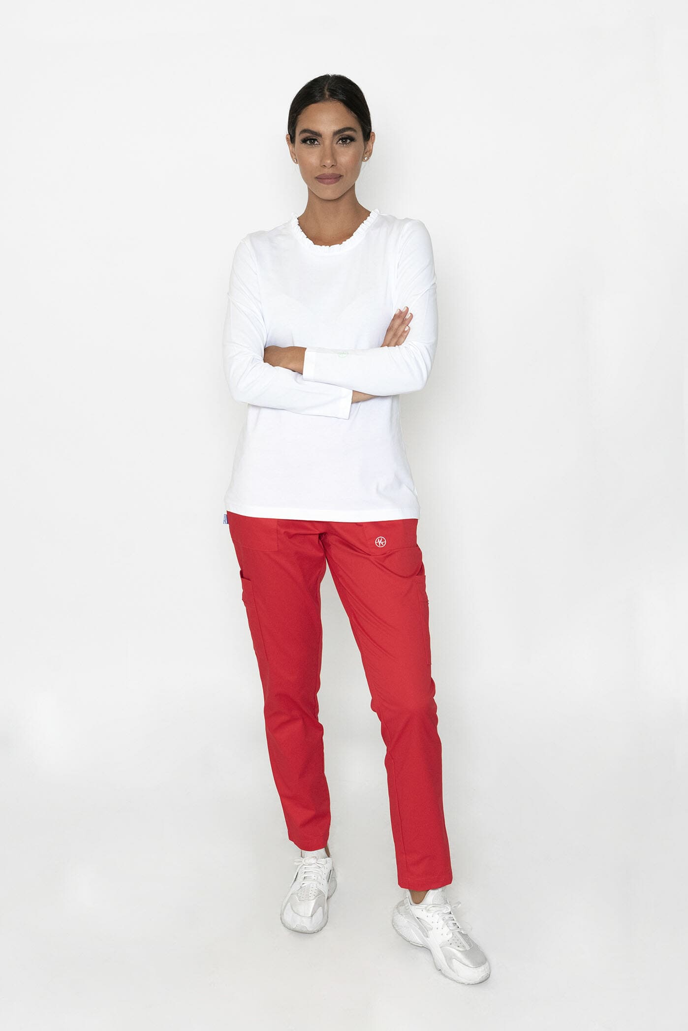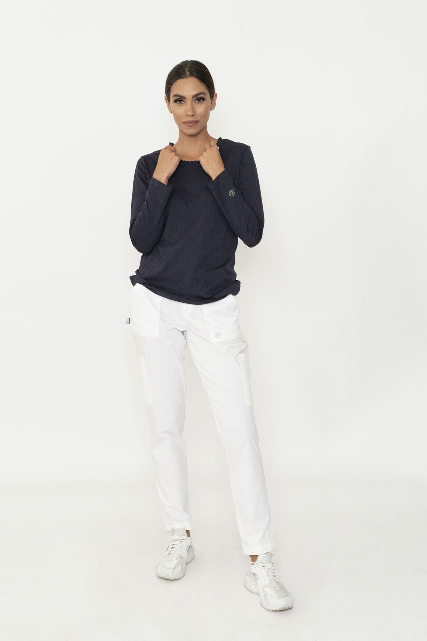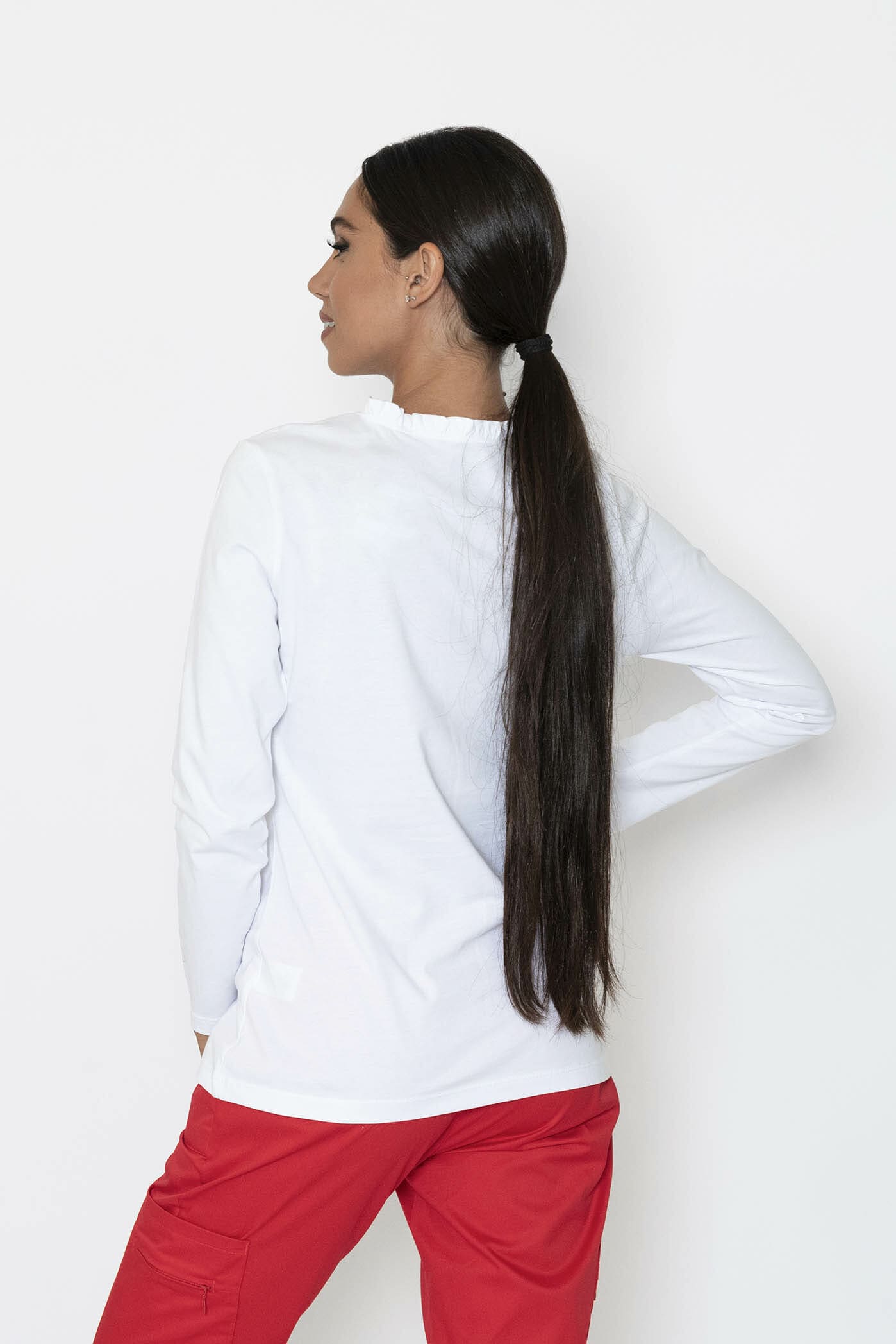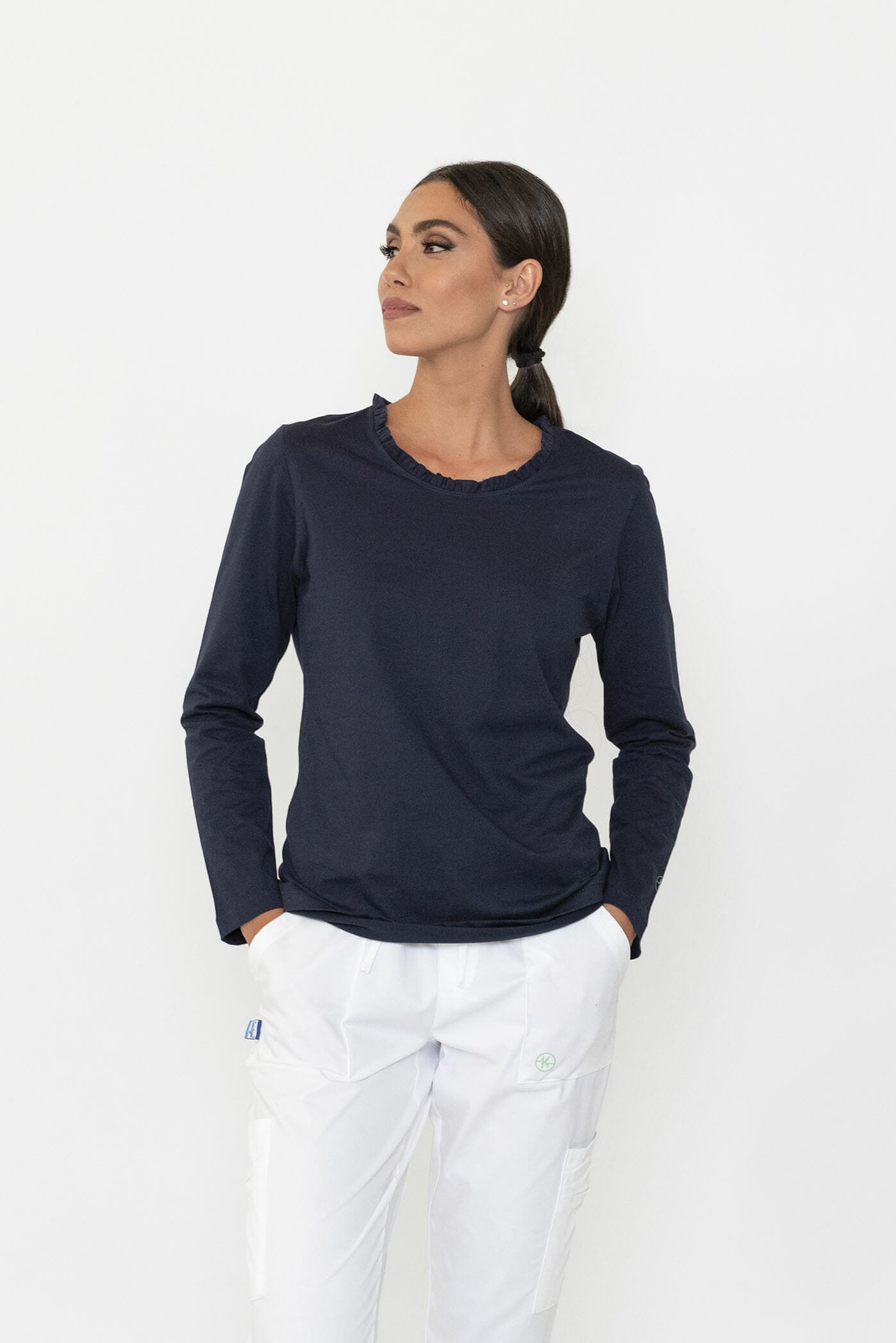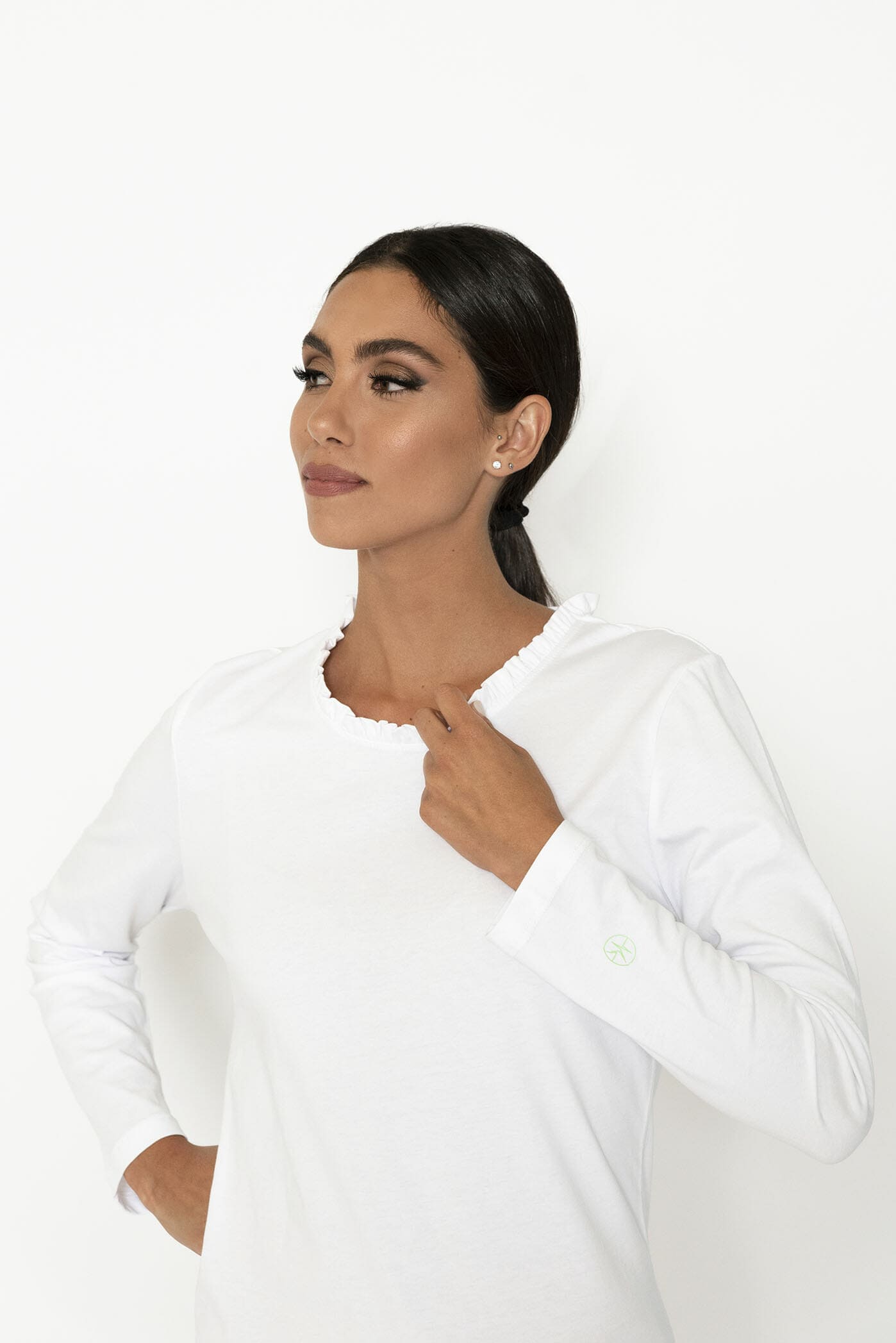 Langärmliges Damen-T-Shirt mit Rüschen am Ausschnitt und kleinem Logo-Print auf dem Ärmel. Gekennzeichnet durch eine schlichte und feminine Linie