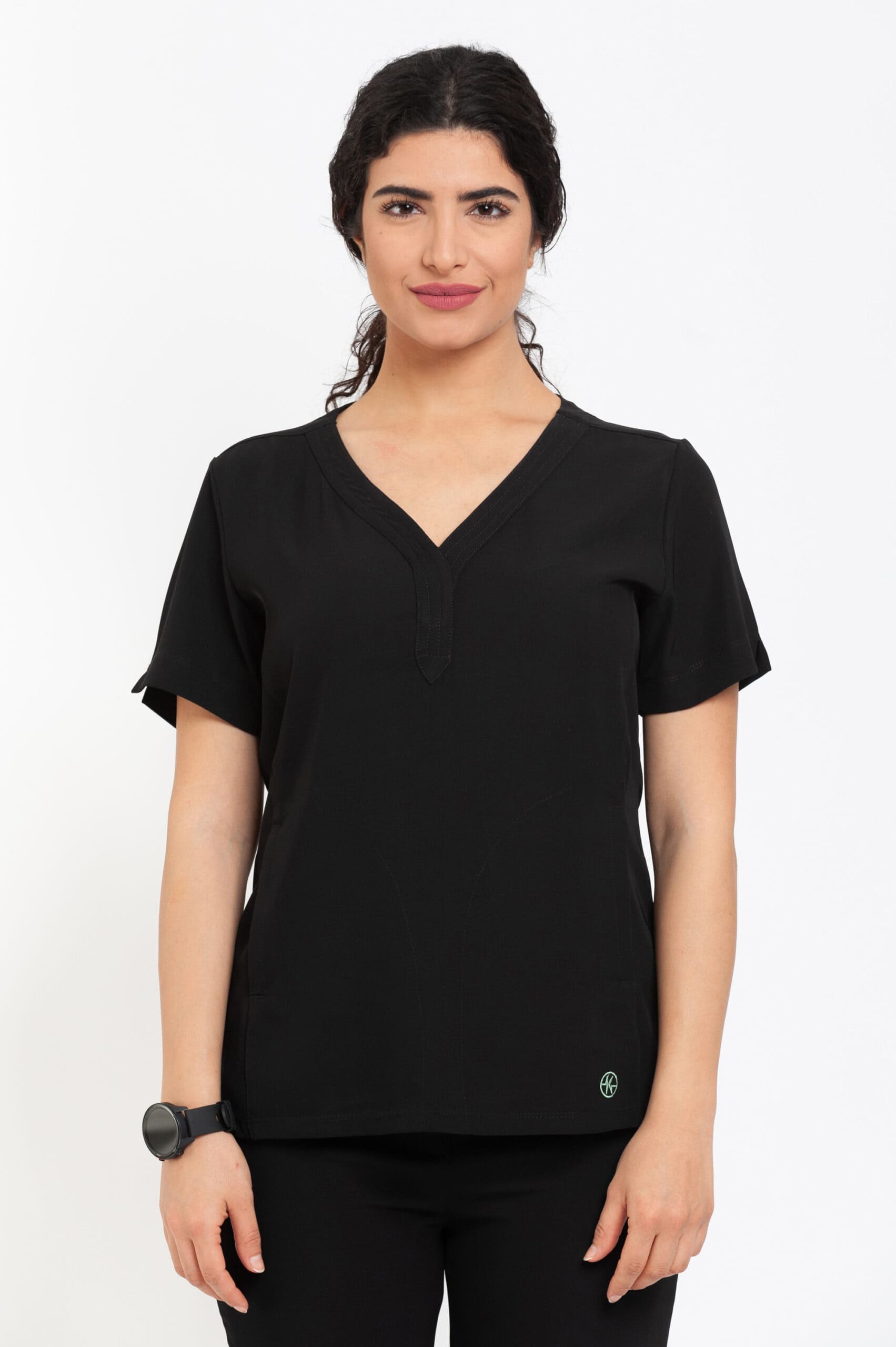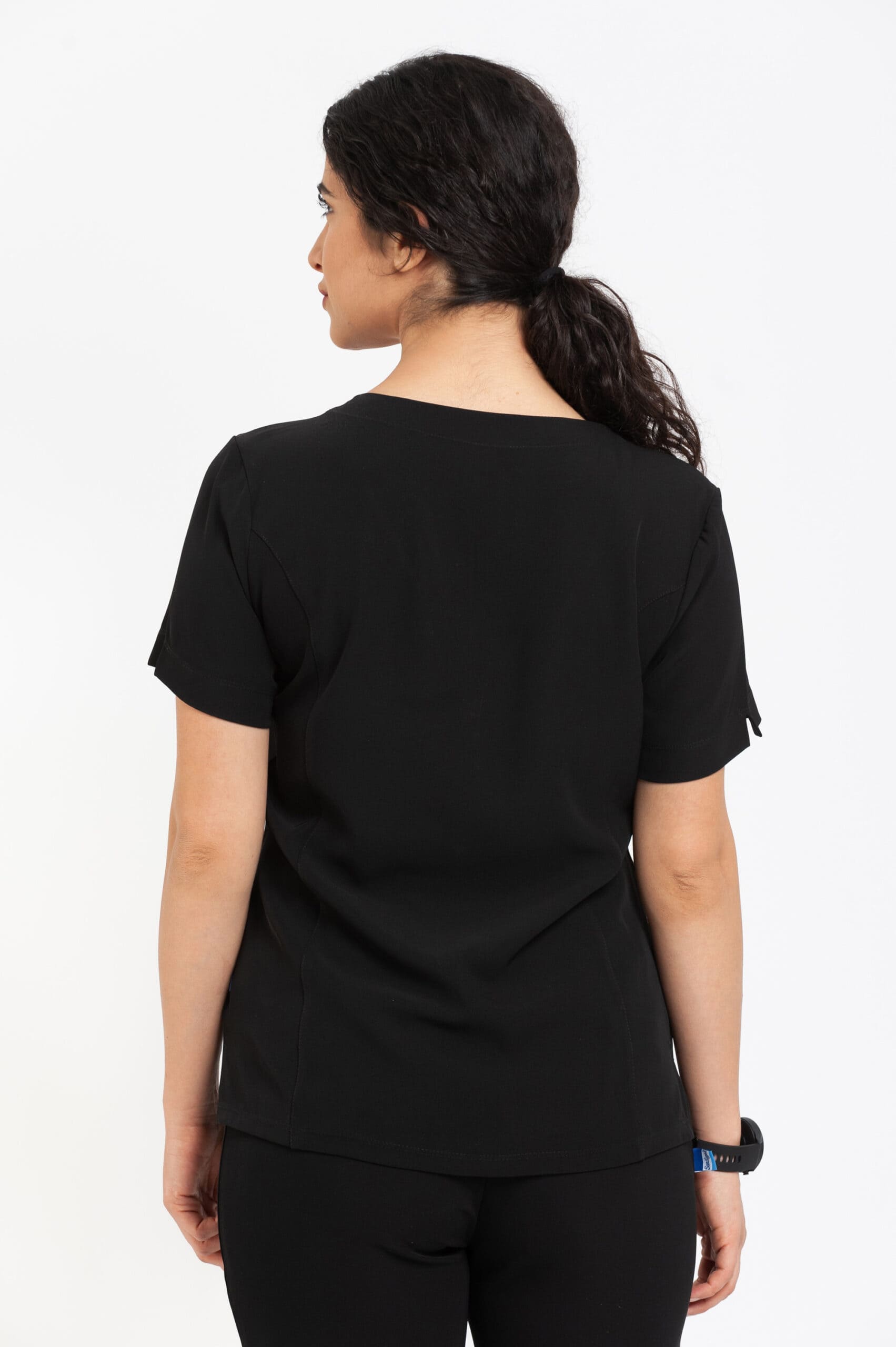 Kurzärmlige Damentunika aus innovativem 4-Wege-Stretch-Crêpe-Stoff, verbindet die feminine Linie mit außergewöhnlichem Komfort. Der fließende, dehnbare und atmungsaktive Stoff garantiert maximalen Komfort.
