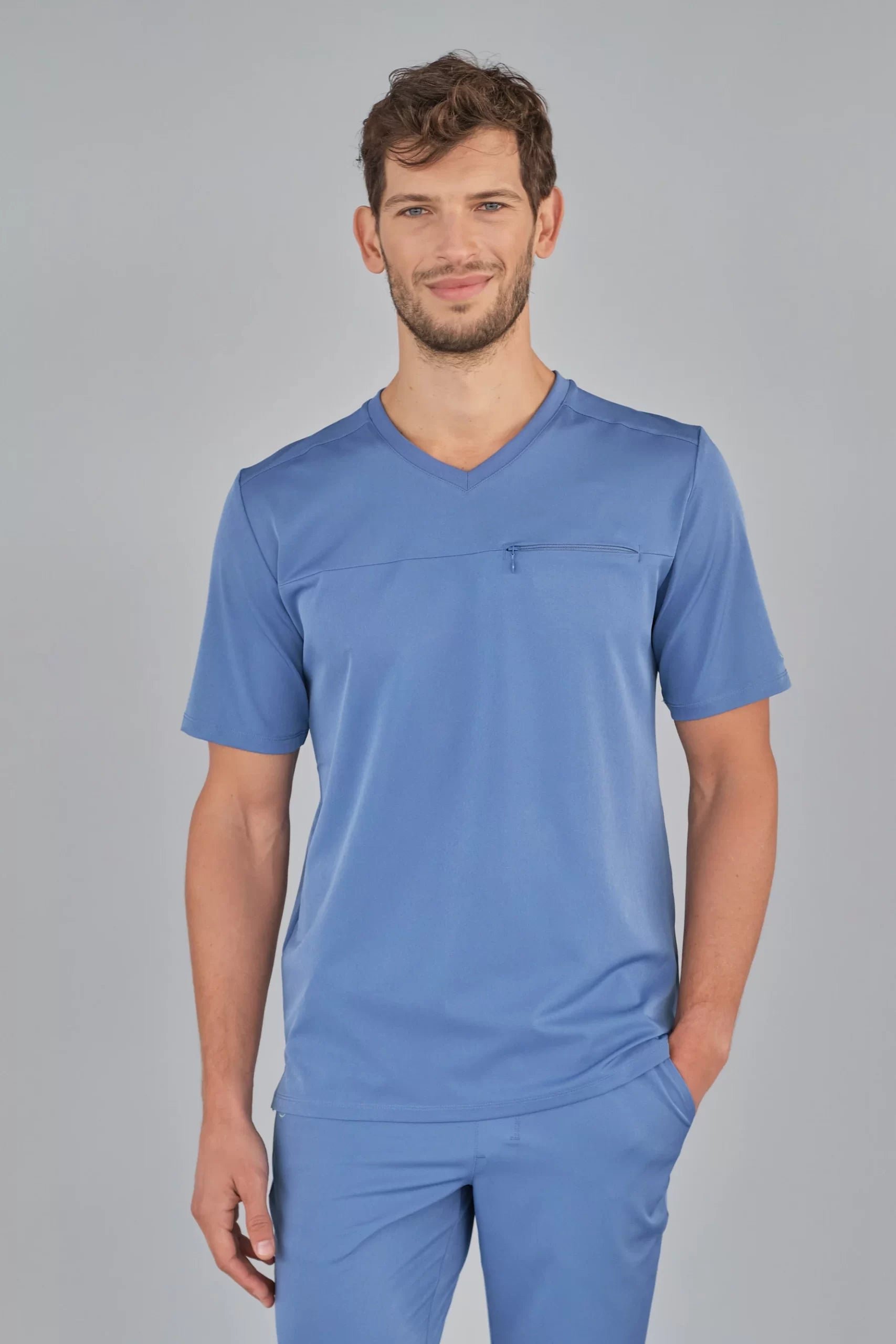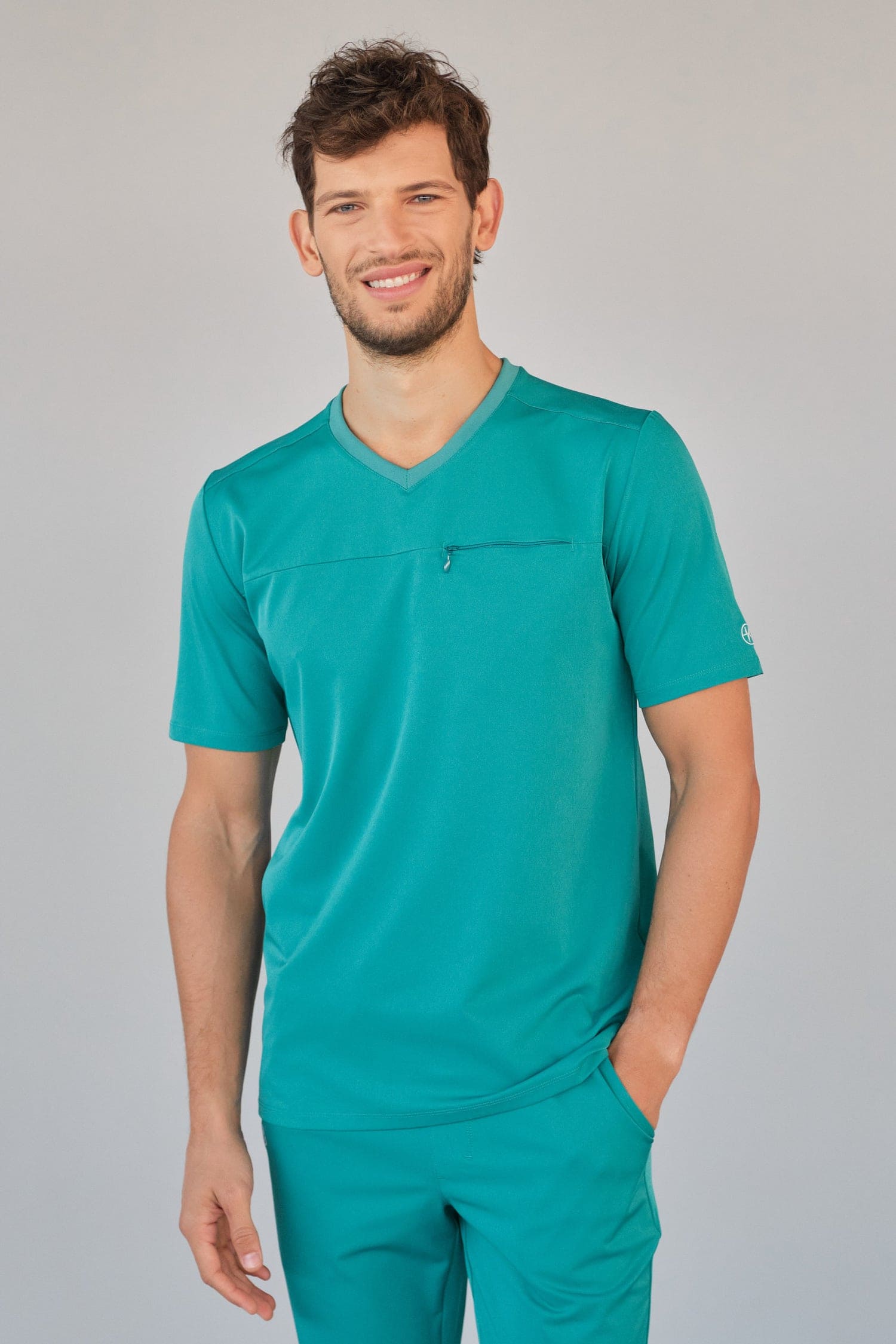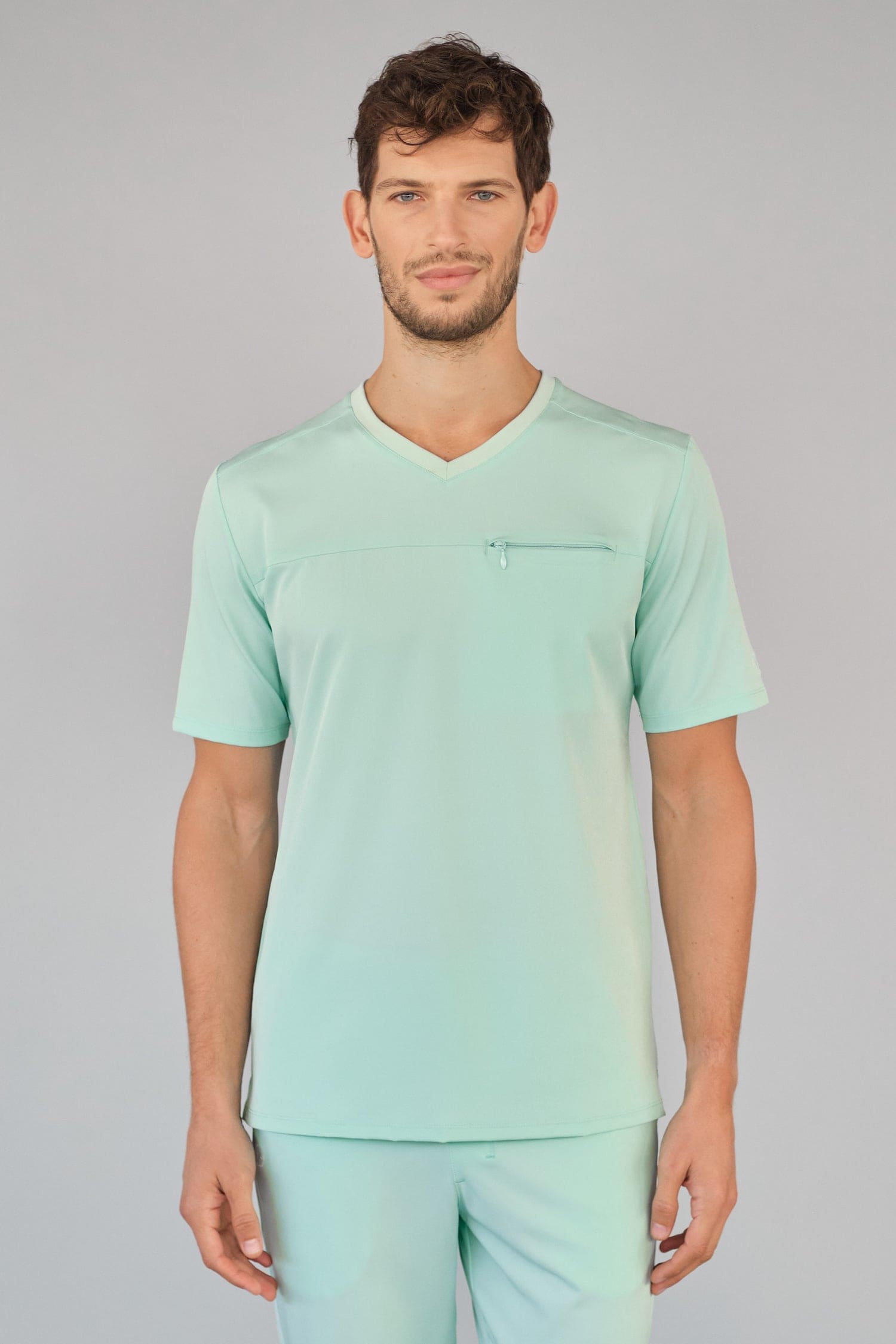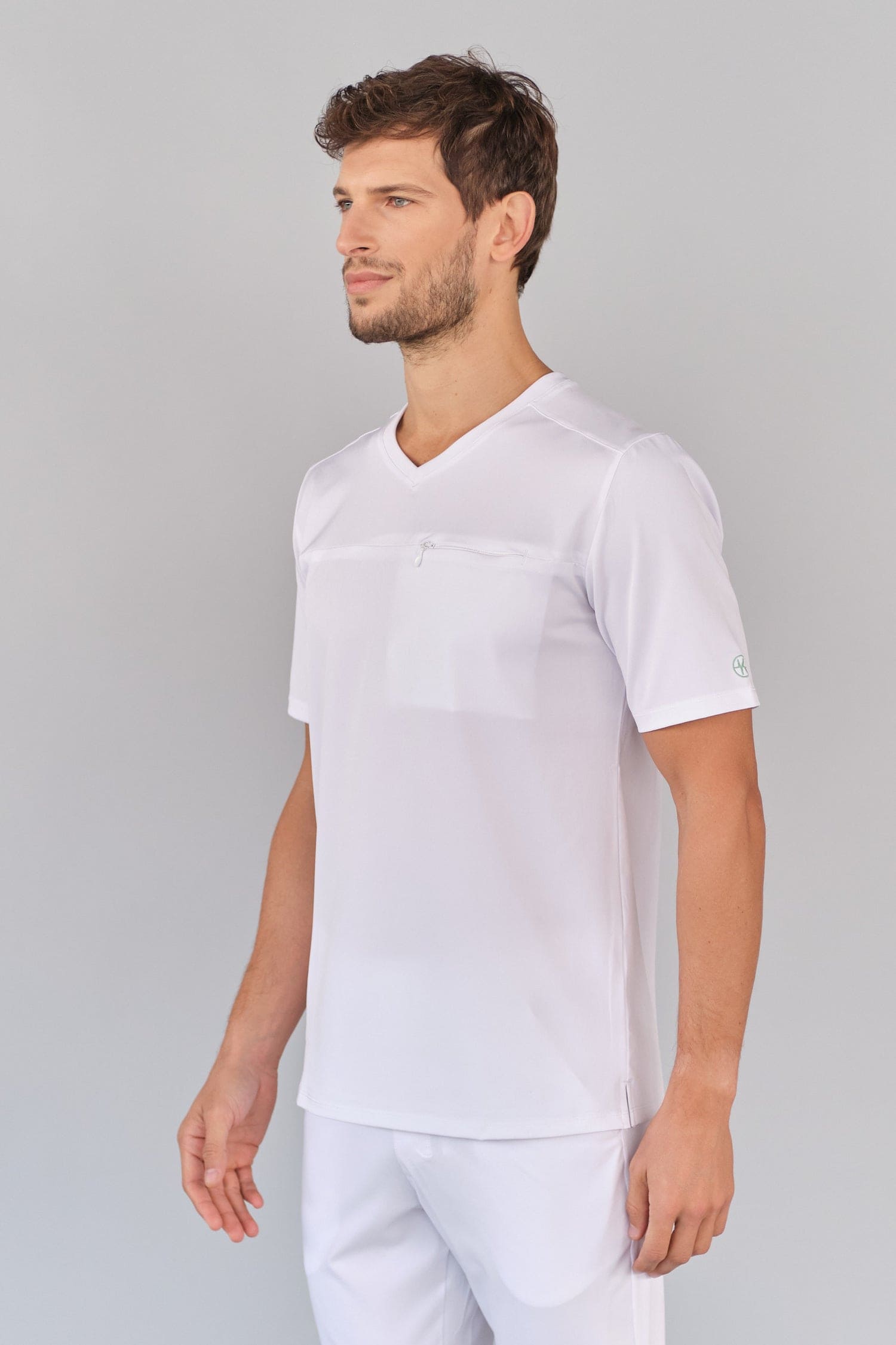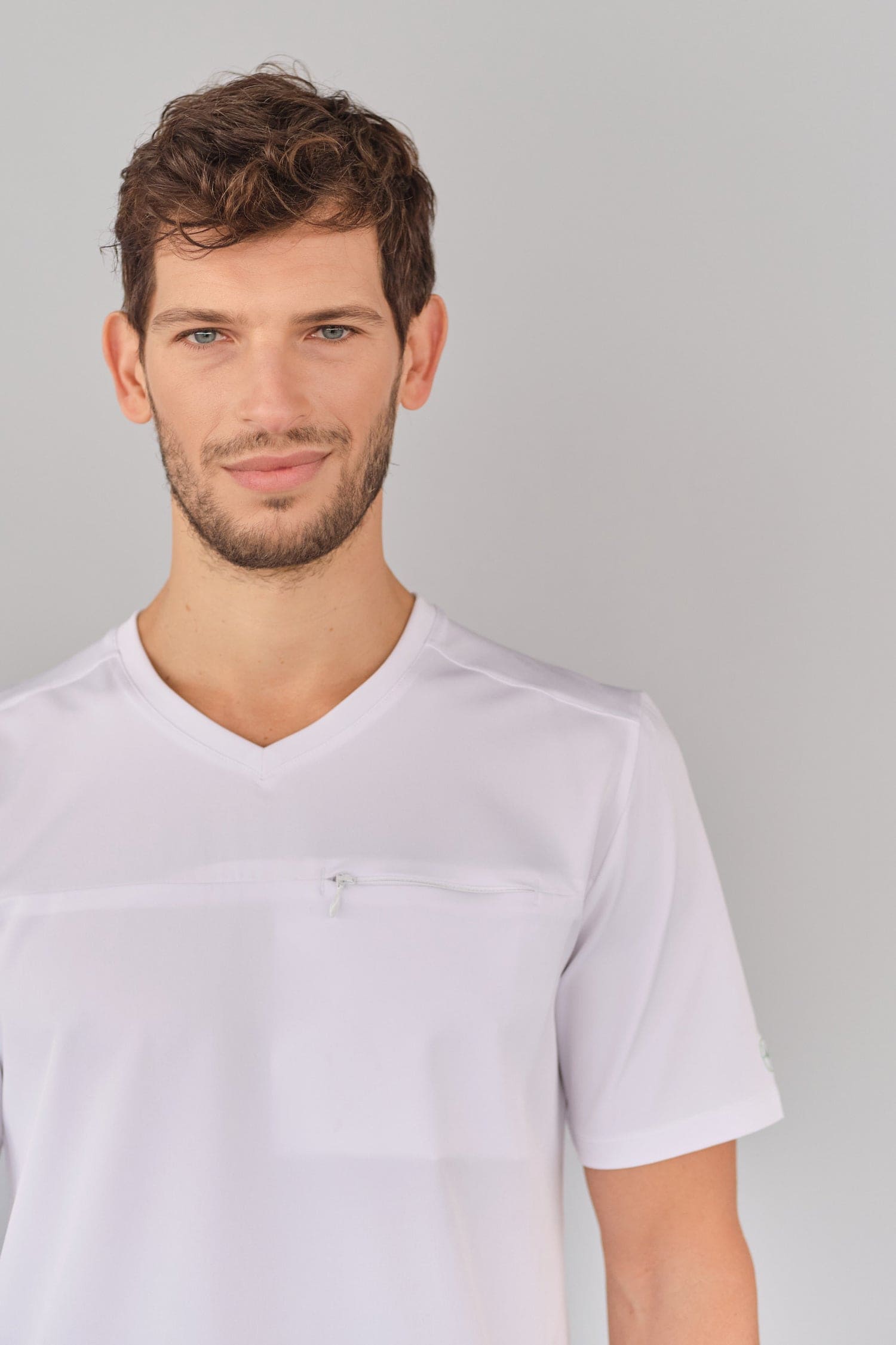 Kurzärmelige Herrentunika aus Mikrofaserstoff. Es hat einen taillierten und modernen Stil. Der gerippte V-Ausschnitt bietet mehr Schutz beim Arbeiten, während Sie in der Brusttasche mit Reißverschluss Ihre wichtigsten Dinge verstauen können. Der weiche und elastische Stoff garantiert Bewegungsfreiheit und ein angenehmes Tragegefühl, während die Teflon®-Behandlung für wasserabweisenden und schmutzabweisenden Schutz sorgt