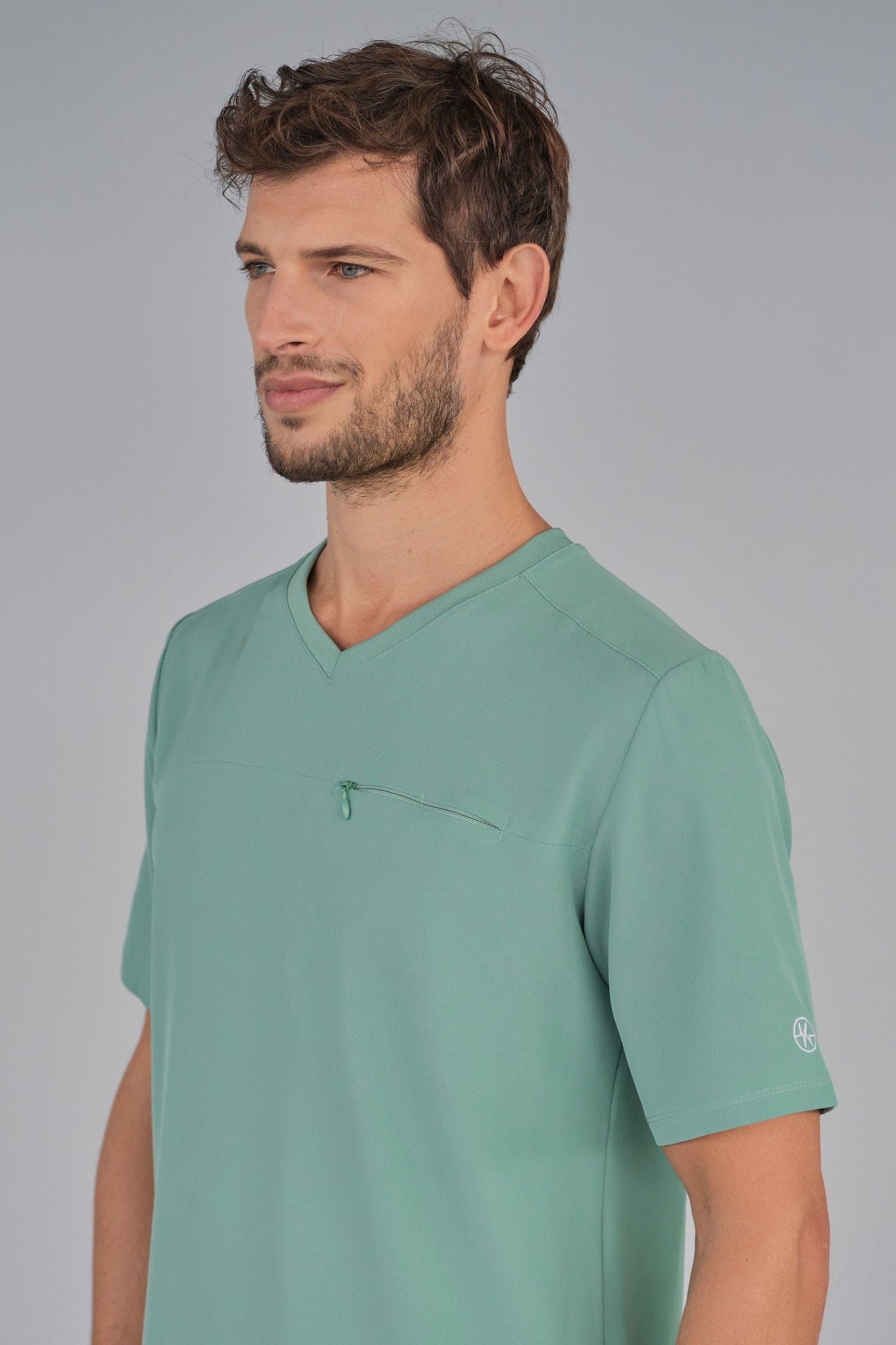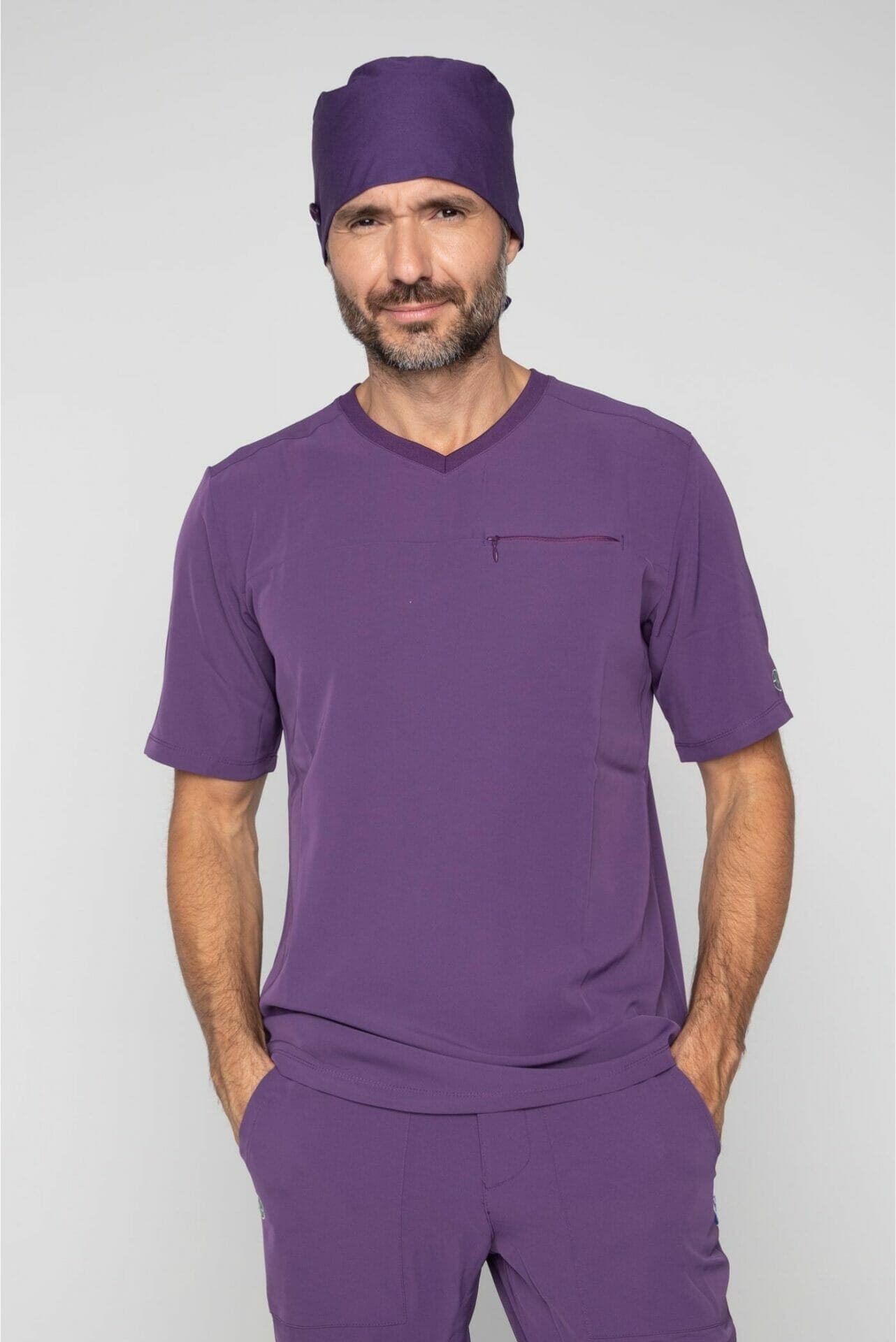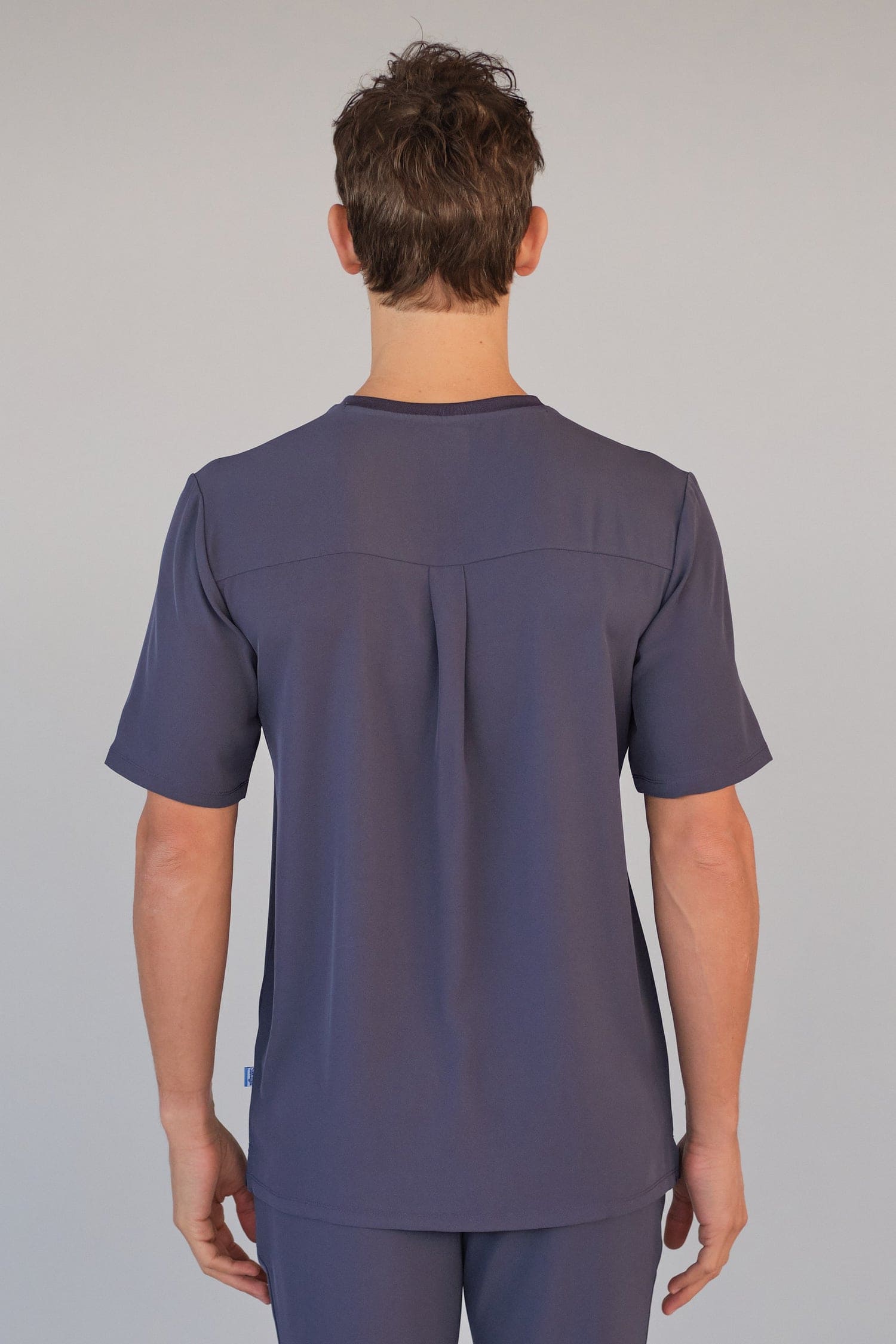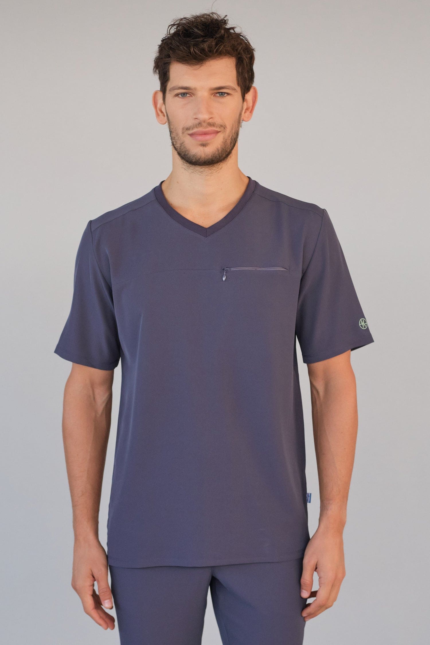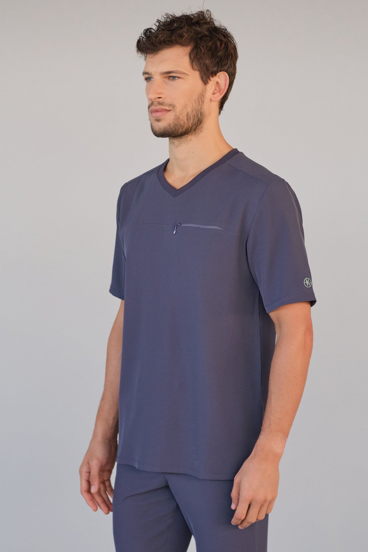 Kurzärmelige gerippte Herren-Tunika mit V-Ausschnitt aus innovativem 4-Wege-Stretch-Crêpe-Stoff, der einen modernen und eleganten Stil bietet. Der fließende, dehnbare und atmungsaktive Stoff garantiert maximalen Komfort.