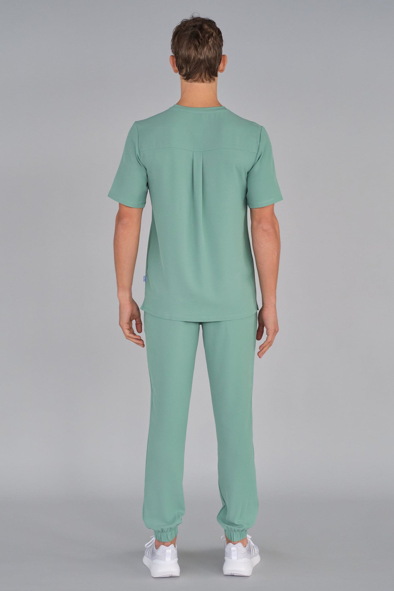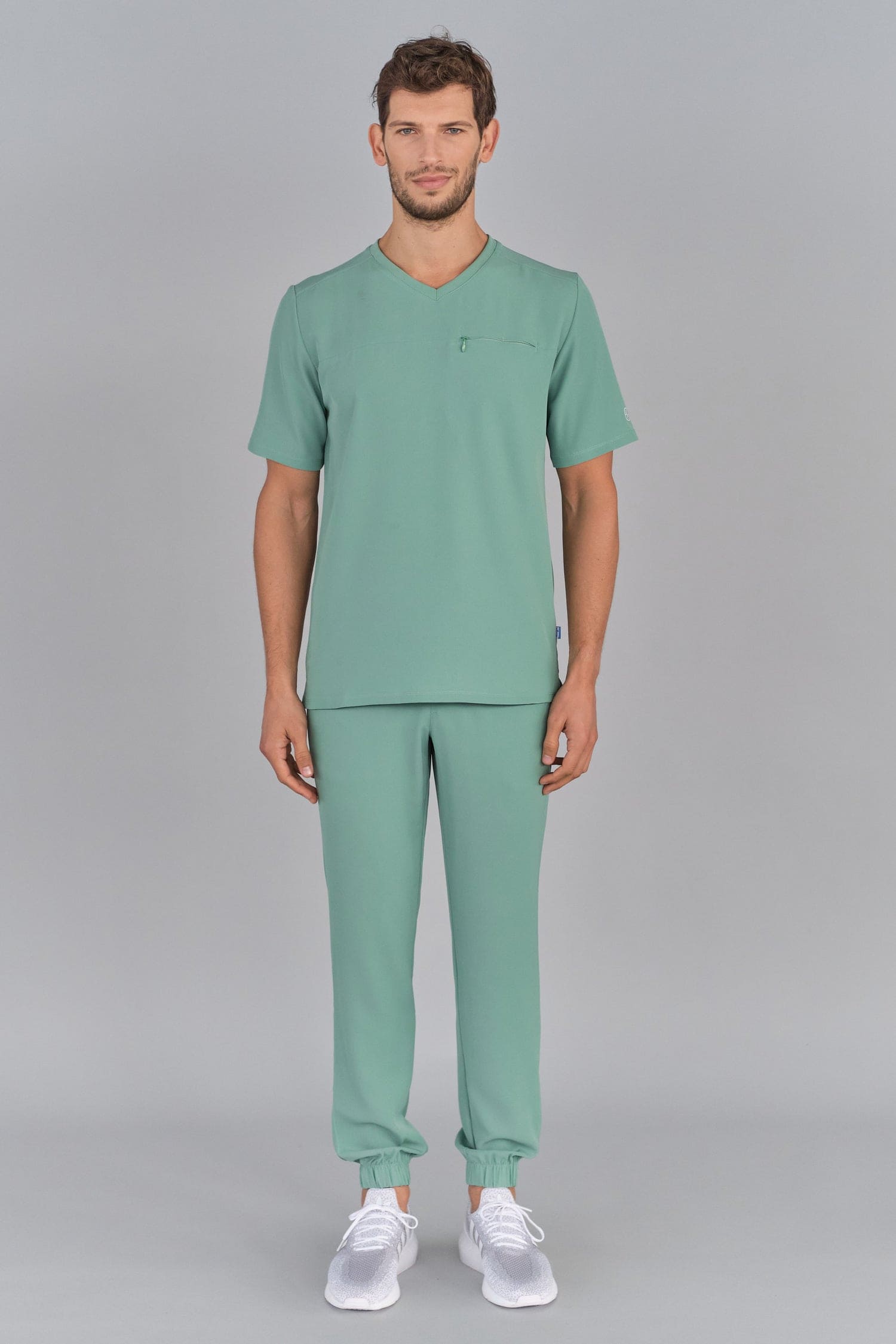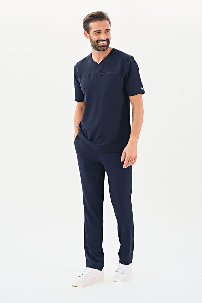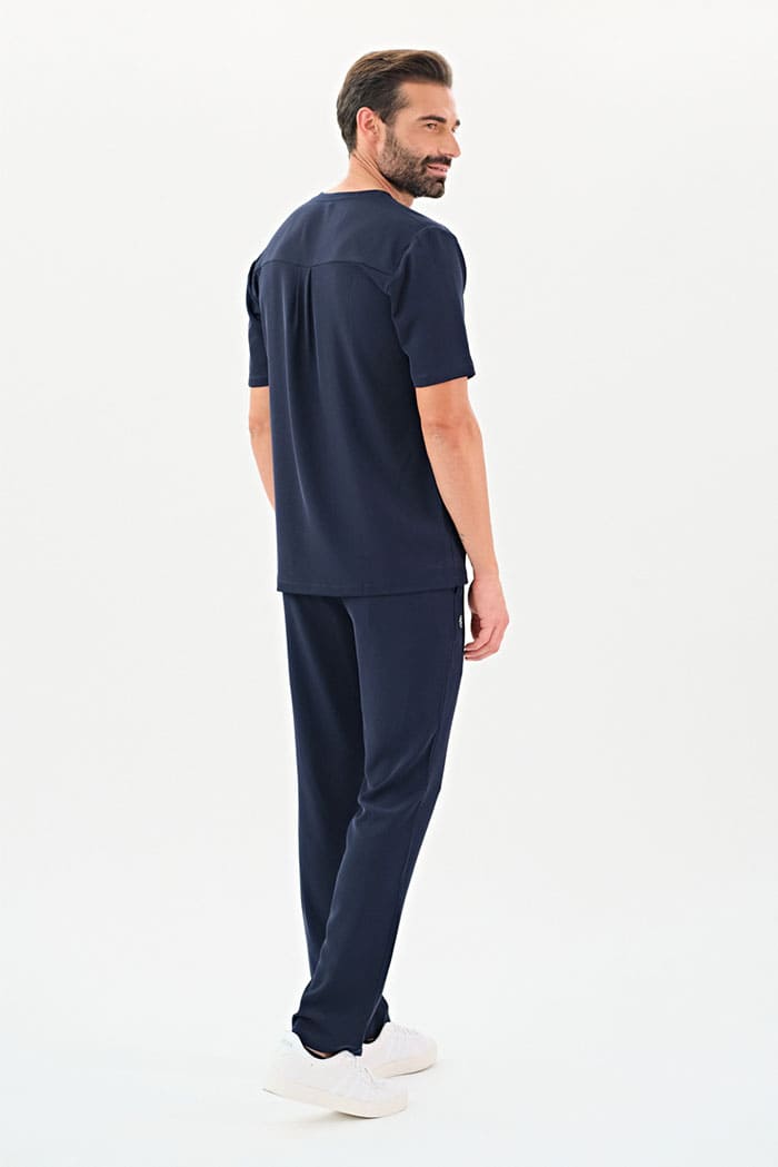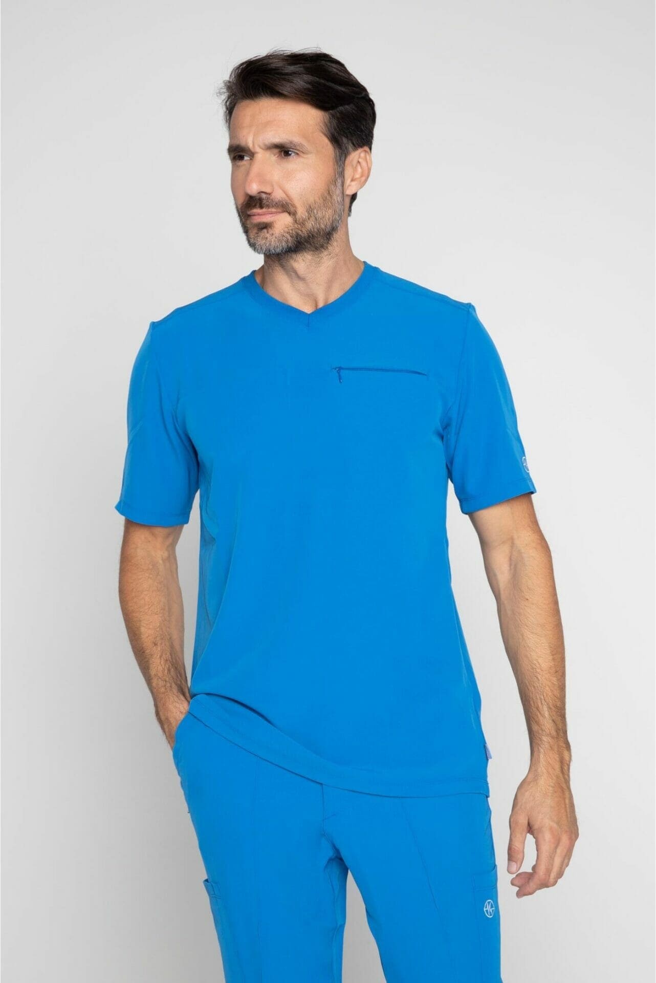 Kurzärmelige gerippte Herren-Tunika mit V-Ausschnitt aus innovativem 4-Wege-Stretch-Crêpe-Stoff, der einen modernen und eleganten Stil bietet. Der fließende, dehnbare und atmungsaktive Stoff garantiert maximalen Komfort.