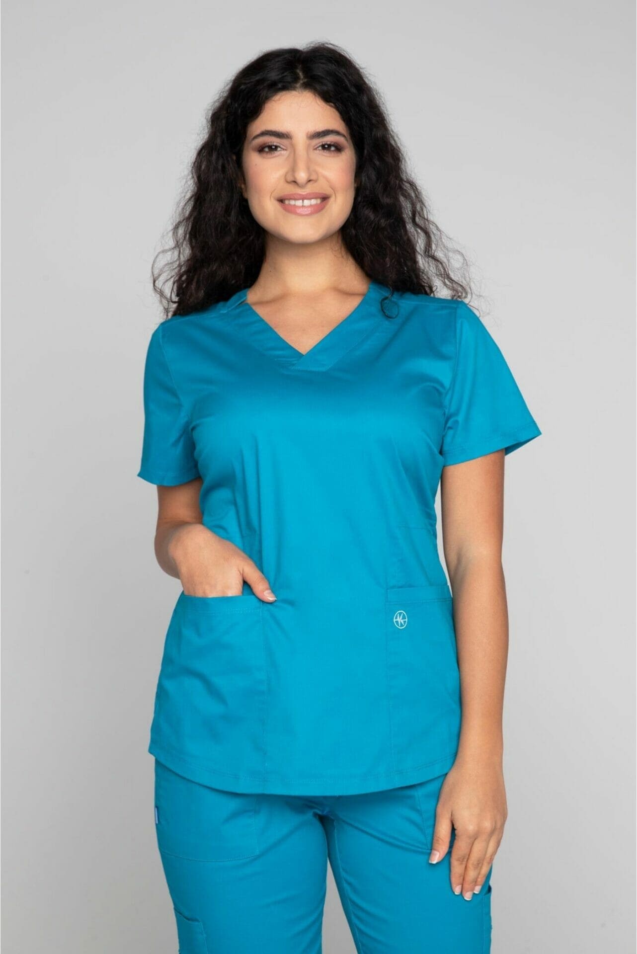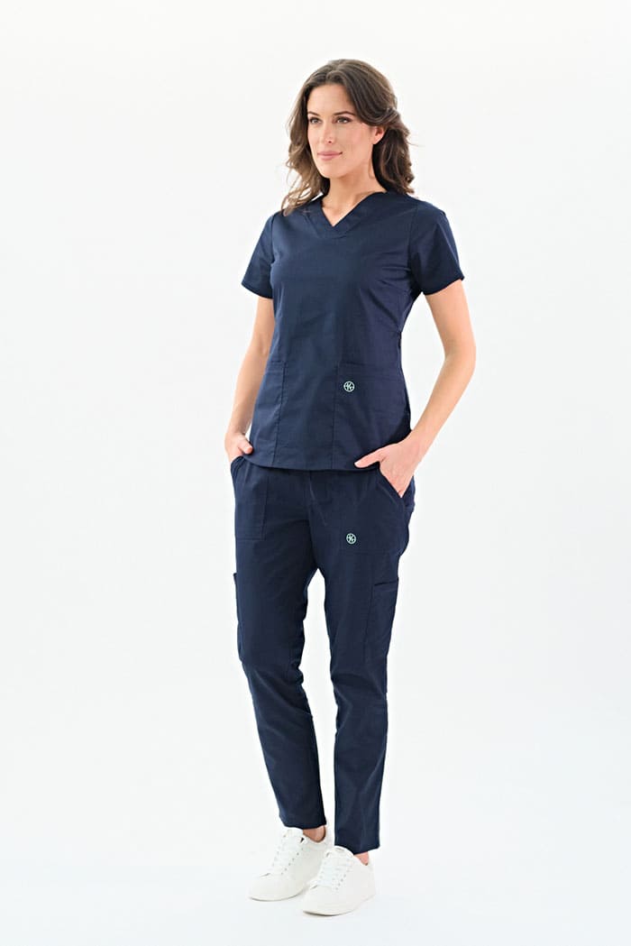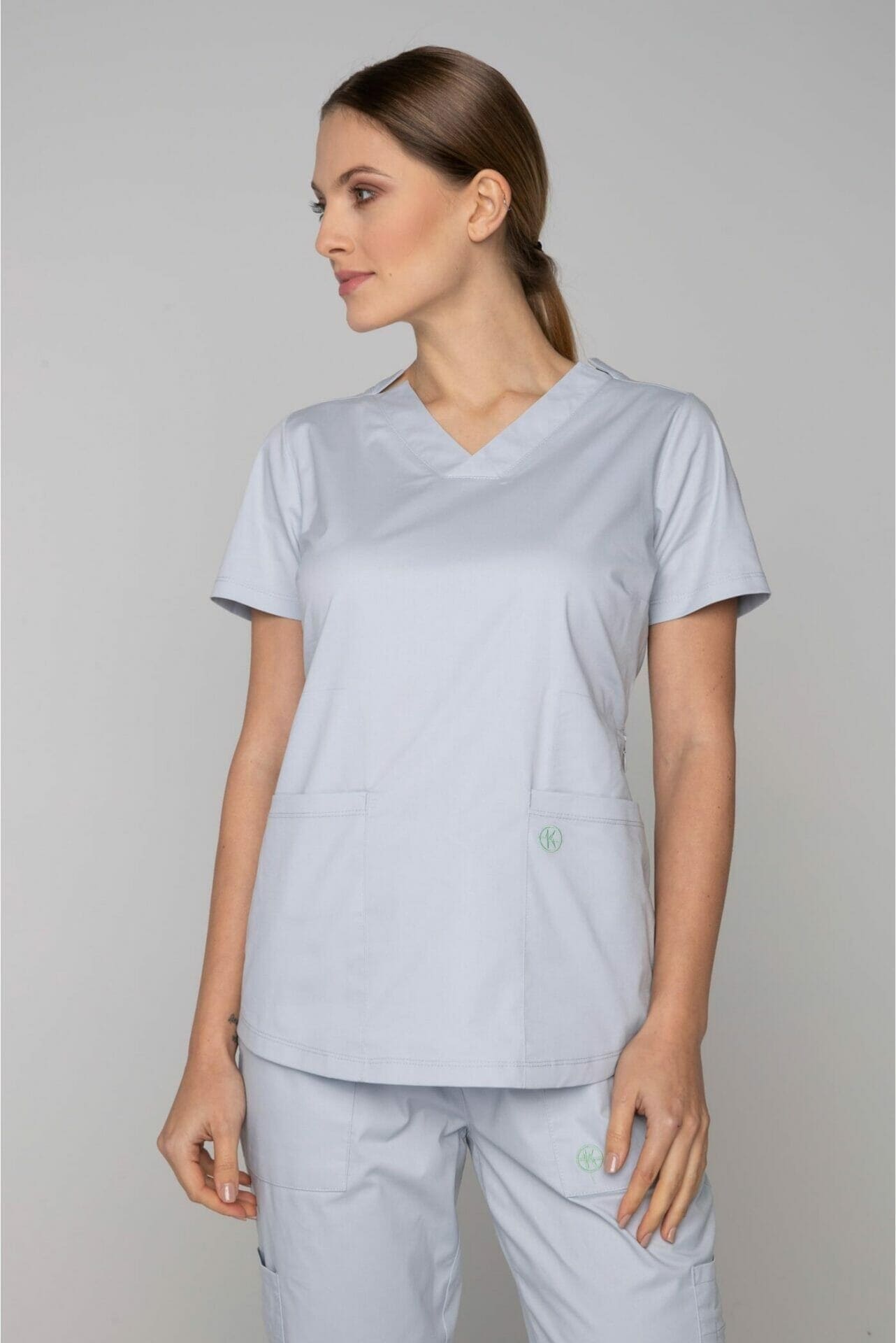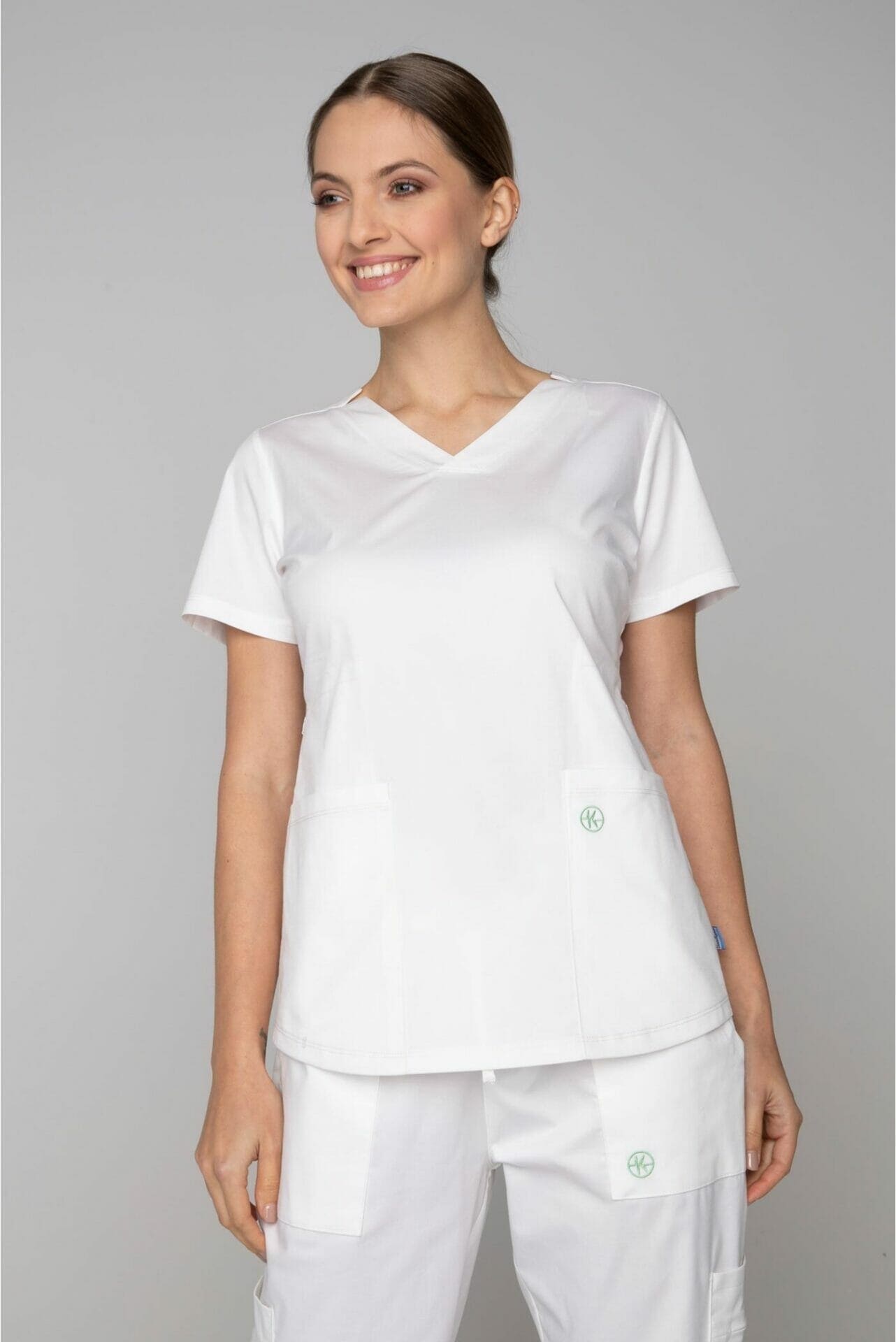 Damen-Tunika mit kurzen Ärmeln und V-Ausschnitt aus hochwertigem Stretch-Baumwollmischgewebe, extrem frisch, langlebig und atmungsaktiv. Es ist eines unserer meistverkauften Modelle mit praktischen Taschen und einer engen, modernen Passform