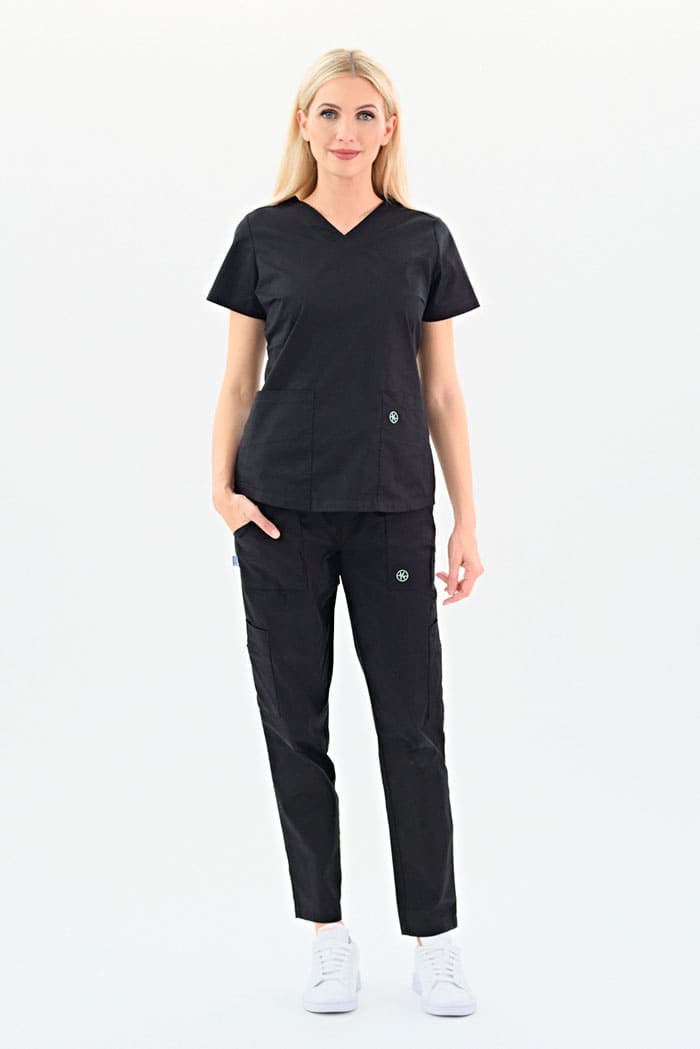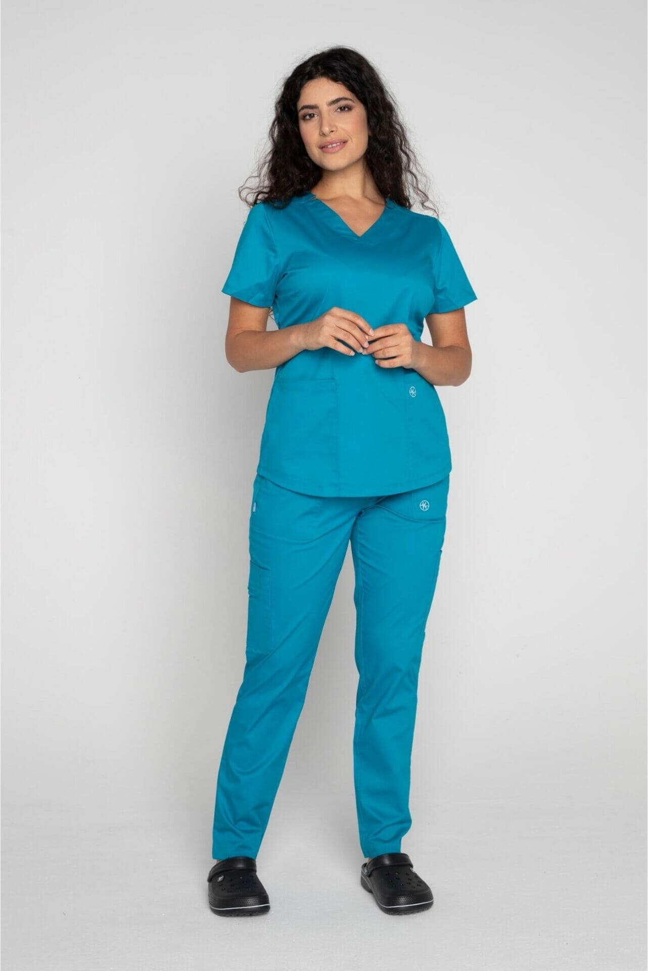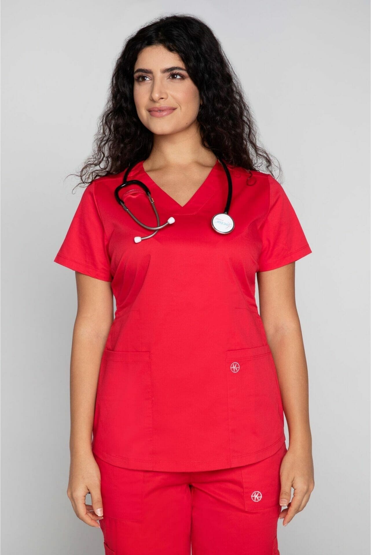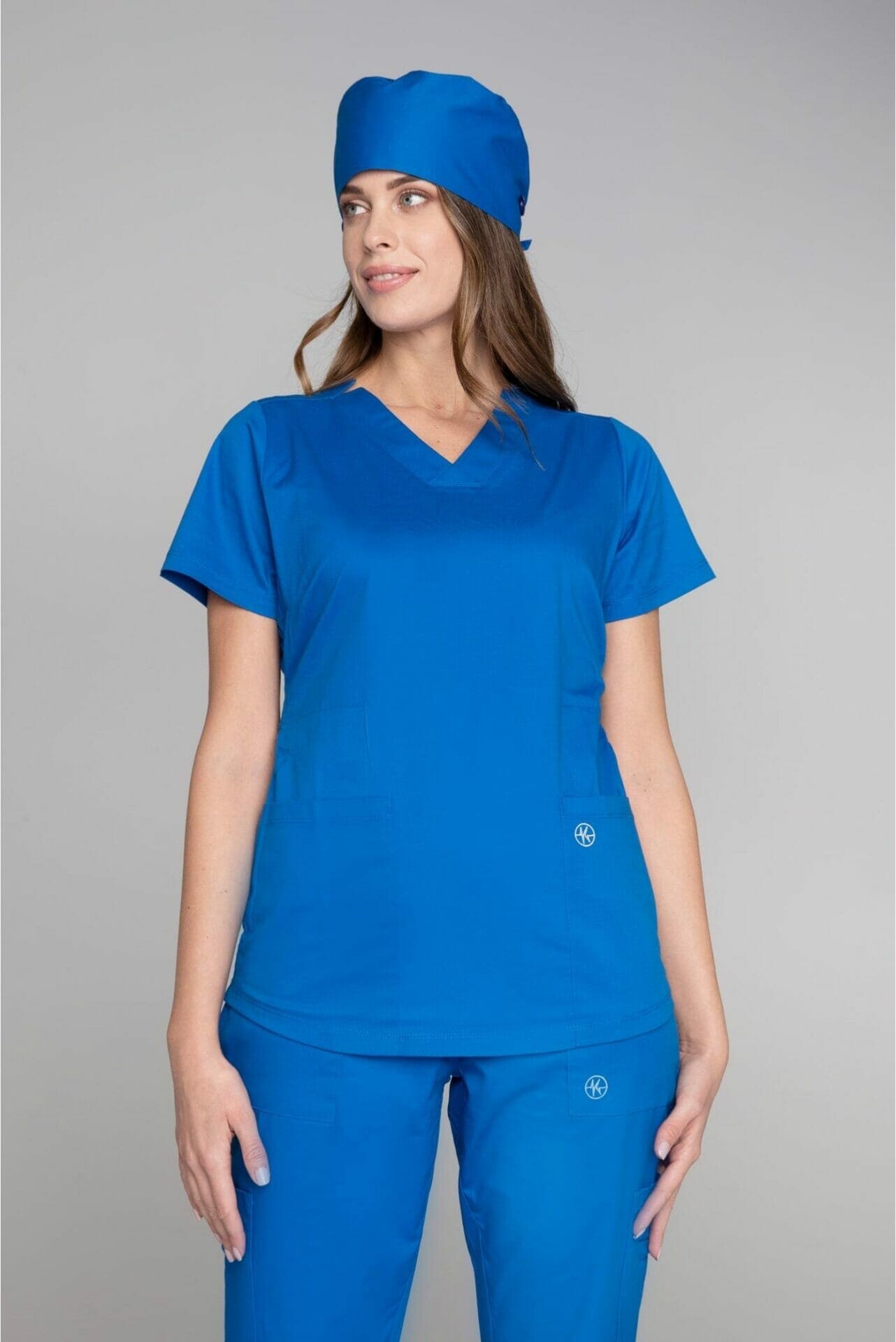 Damen-Tunika mit kurzen Ärmeln und V-Ausschnitt aus hochwertigem Stretch-Baumwollmischgewebe, extrem frisch, langlebig und atmungsaktiv. Es ist eines unserer meistverkauften Modelle mit praktischen Taschen und einer engen, modernen Passform