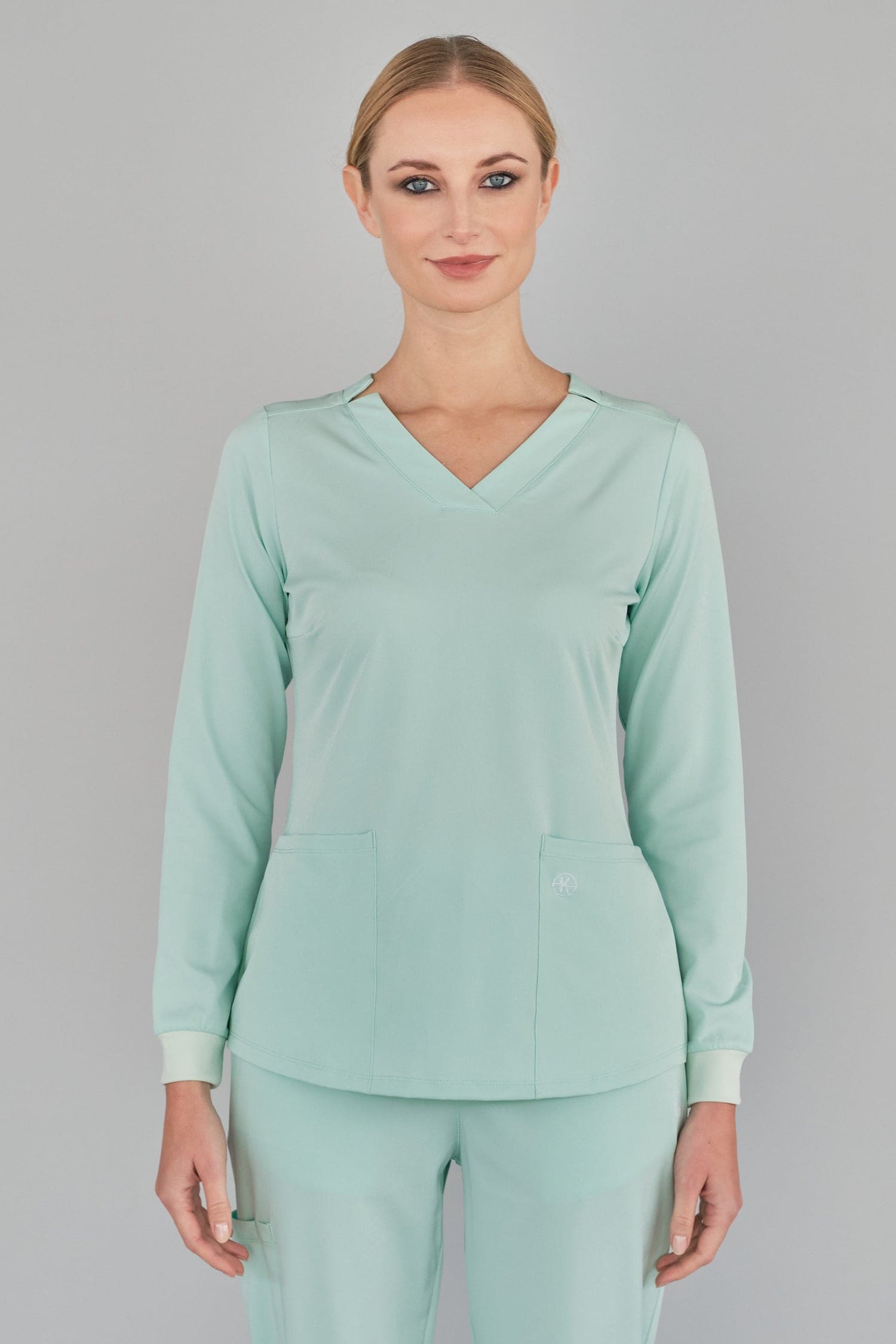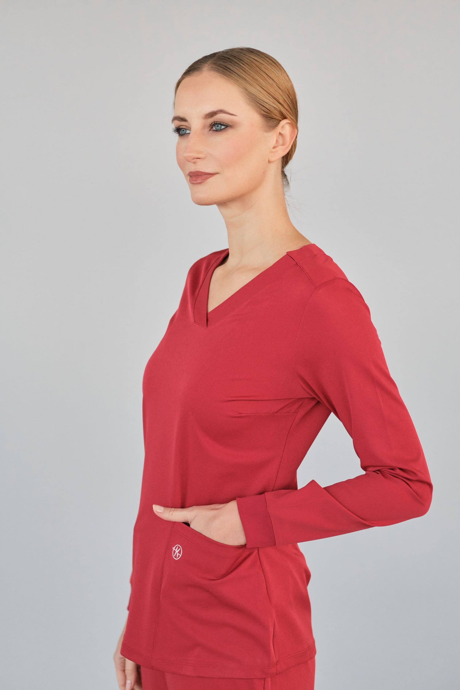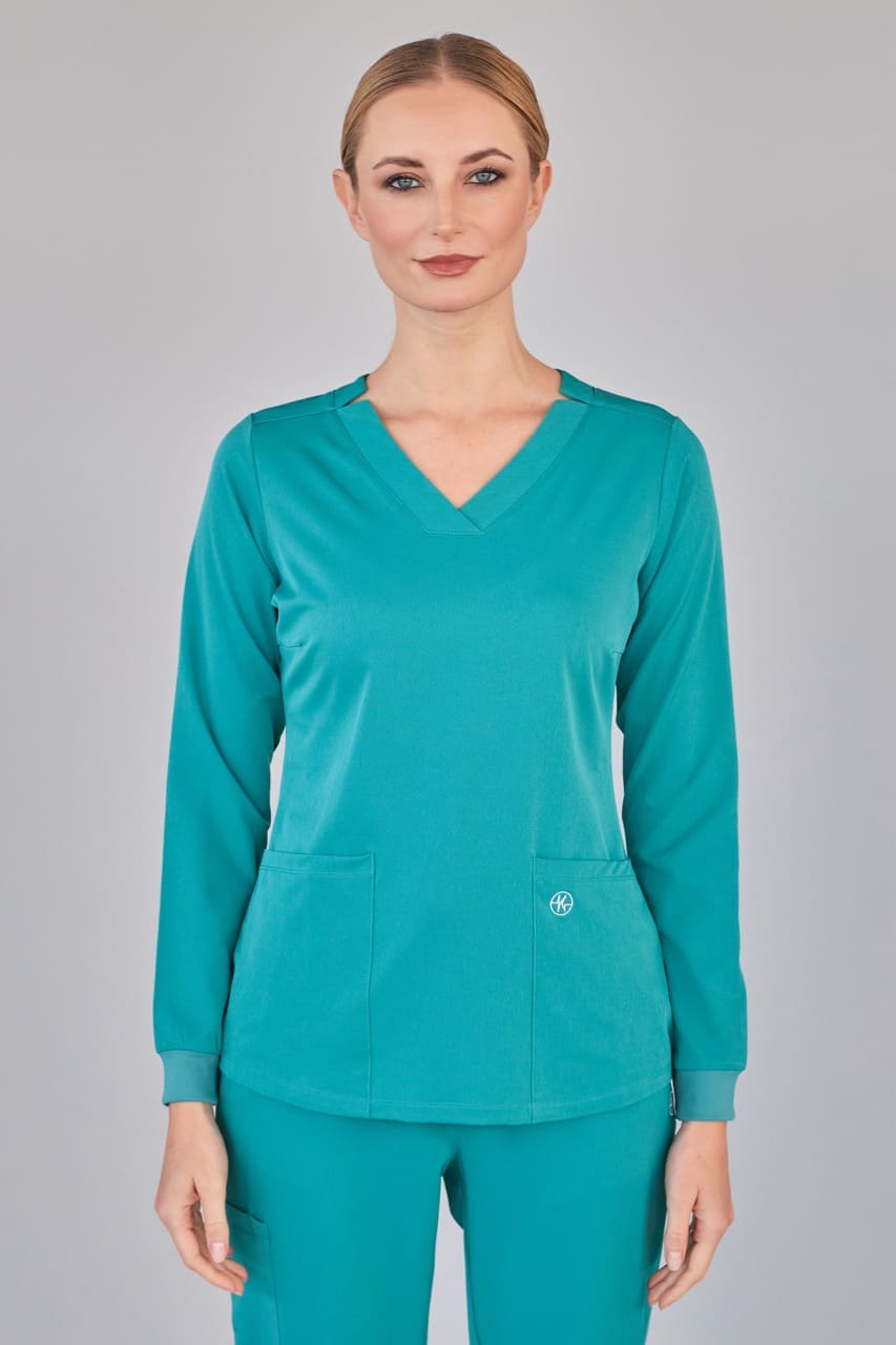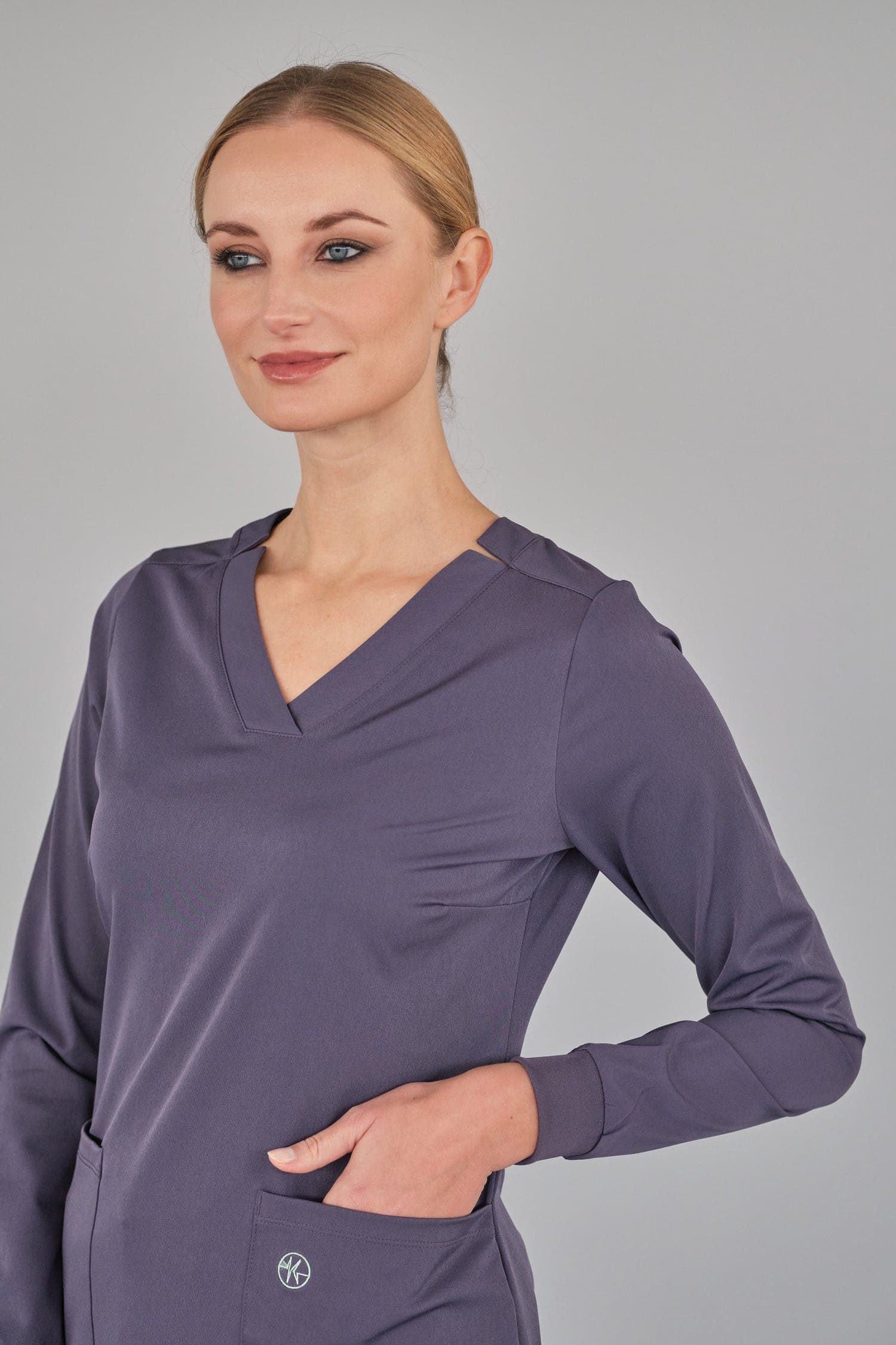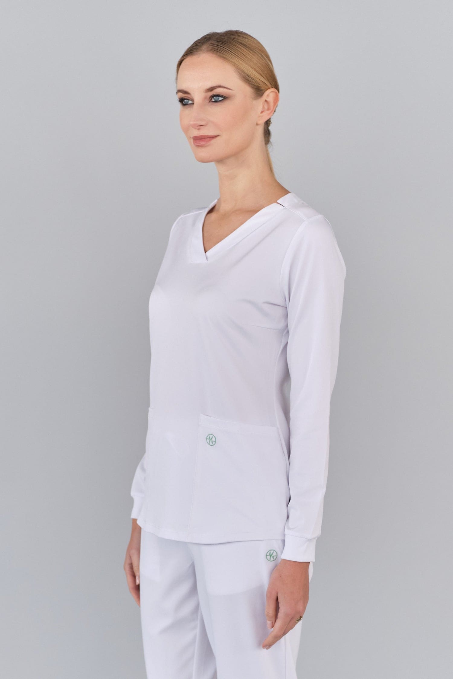 Langärmlige Damen-Tunika mit V-Ausschnitt aus Mikrofasergewebe, das klassischste unserer Modelle mit praktischen Taschen und einer engen, modernen Passform sowie praktischen Rippbündchen. Der weiche und elastische Stoff garantiert Bewegungsfreiheit und ein angenehmes Tragegefühl, während die Teflon®-Behandlung für wasserabweisenden und schmutzabweisenden Schutz sorgt