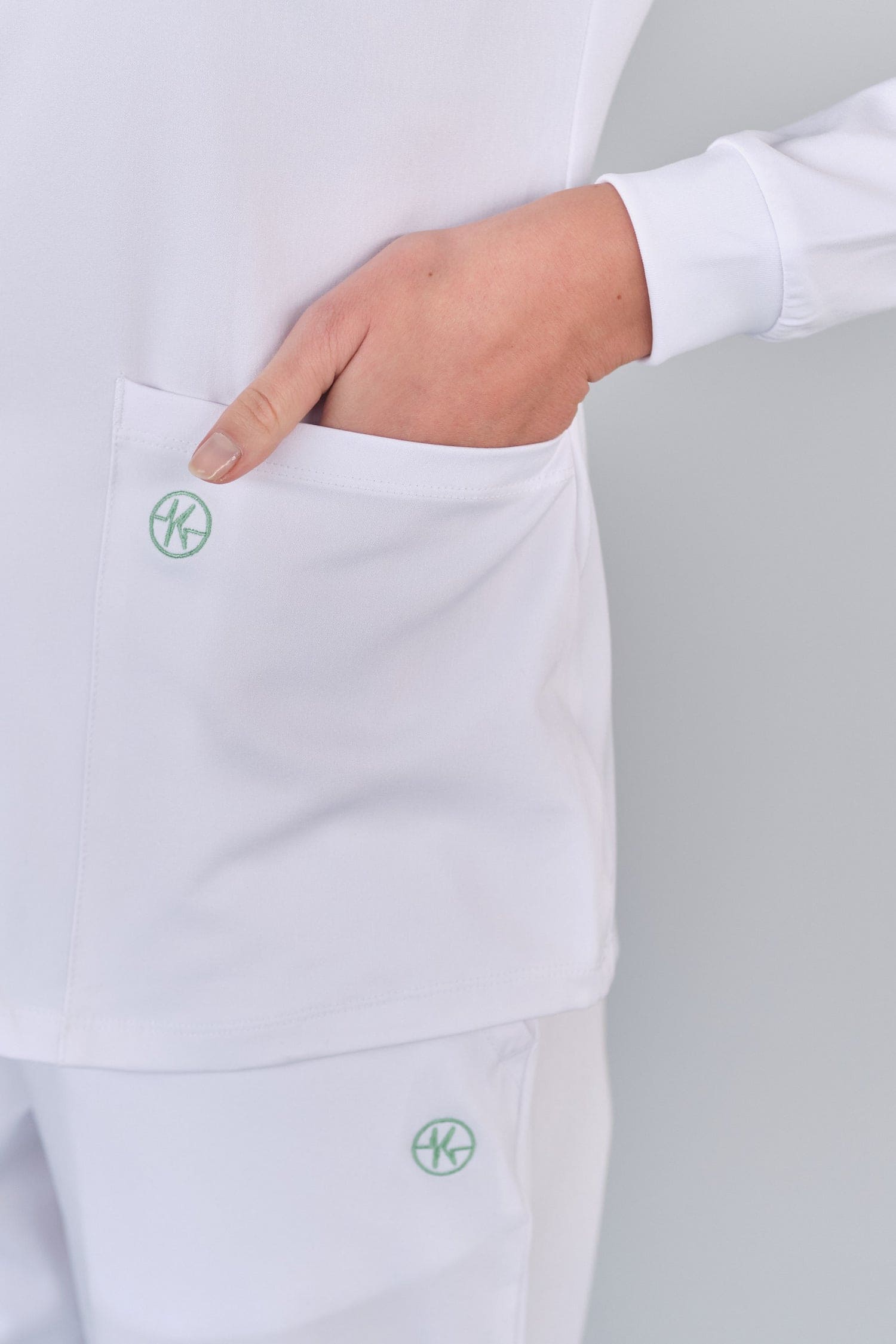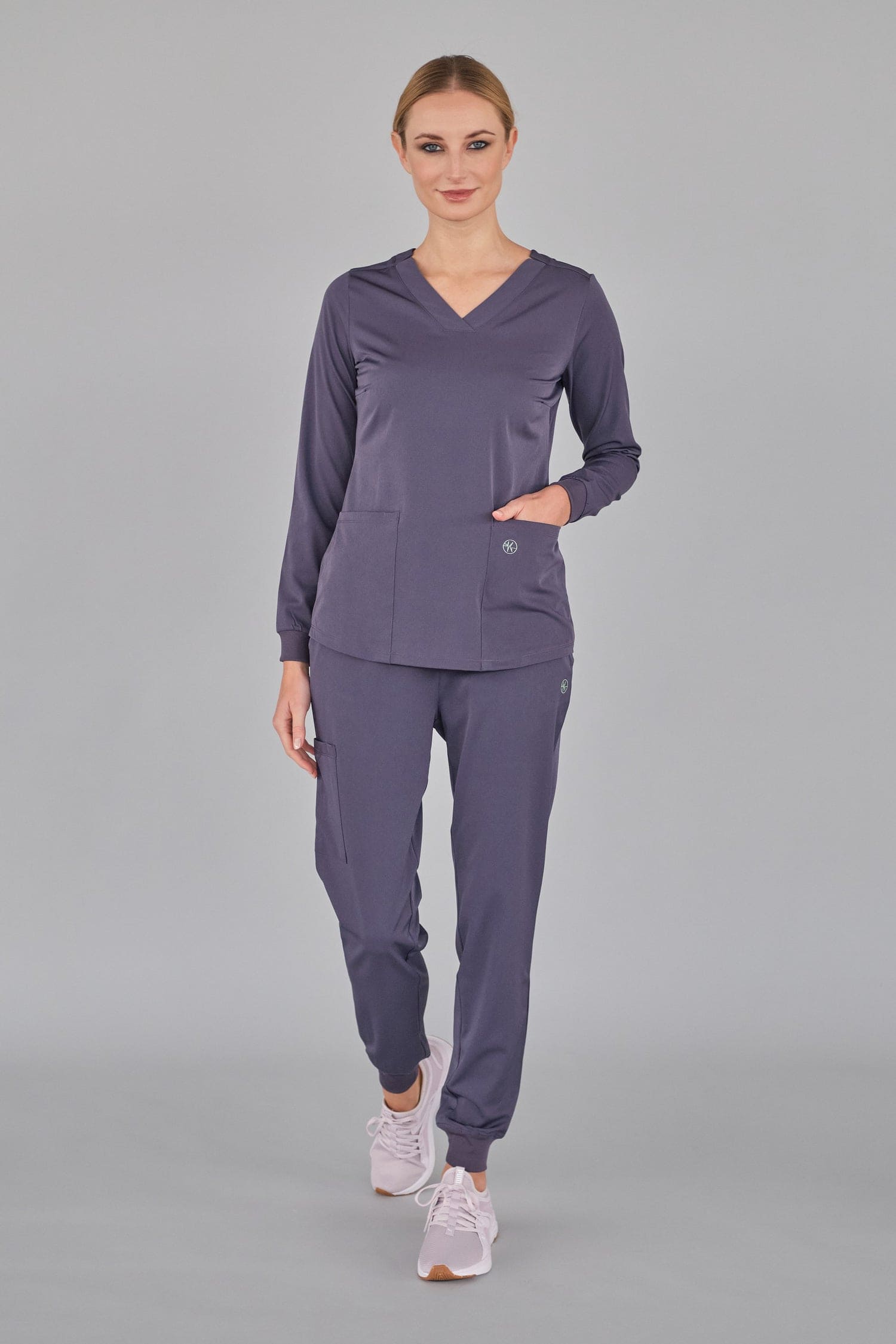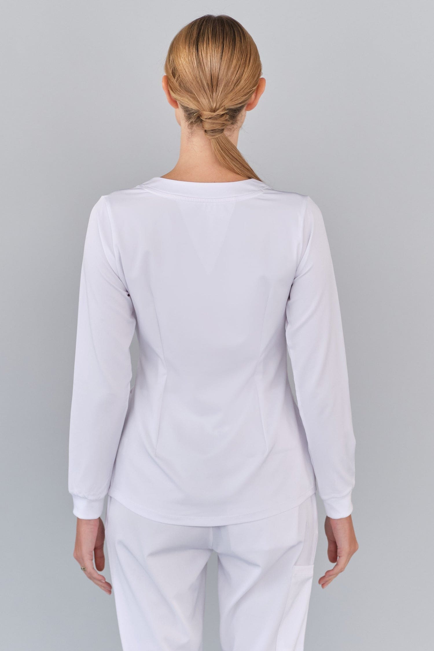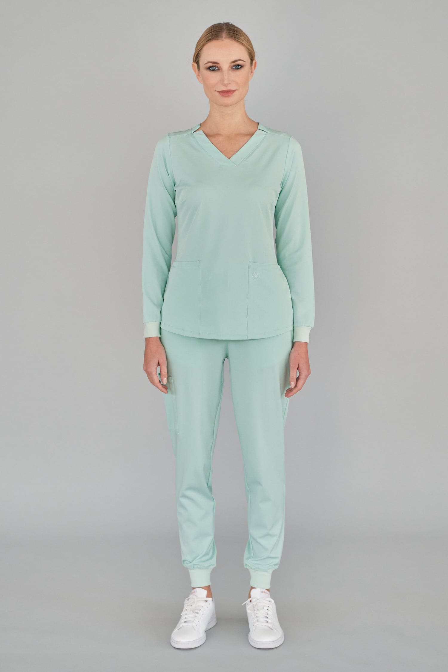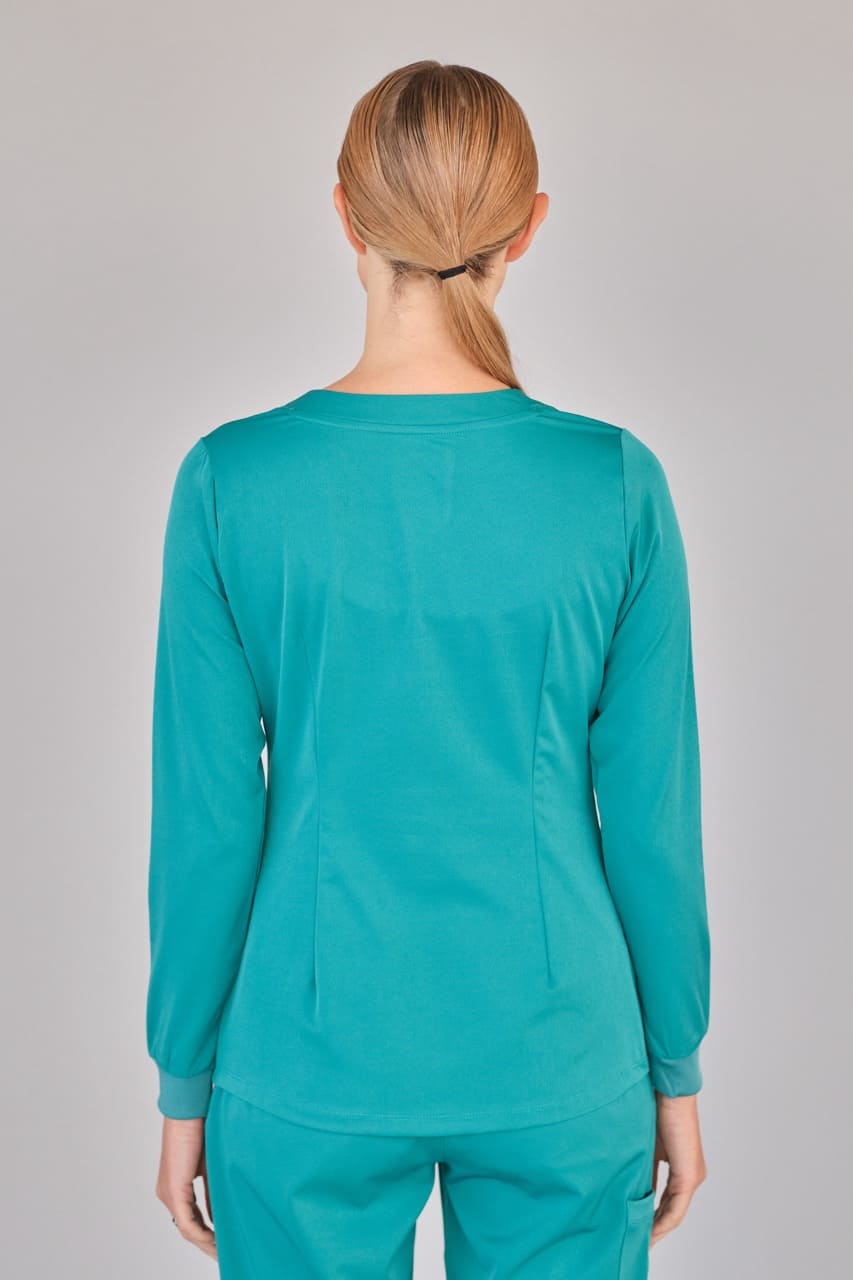 Langärmlige Damen-Tunika mit V-Ausschnitt aus Mikrofasergewebe, das klassischste unserer Modelle mit praktischen Taschen und einer engen, modernen Passform sowie praktischen Rippbündchen. Der weiche und elastische Stoff garantiert Bewegungsfreiheit und ein angenehmes Tragegefühl, während die Teflon®-Behandlung für wasserabweisenden und schmutzabweisenden Schutz sorgt