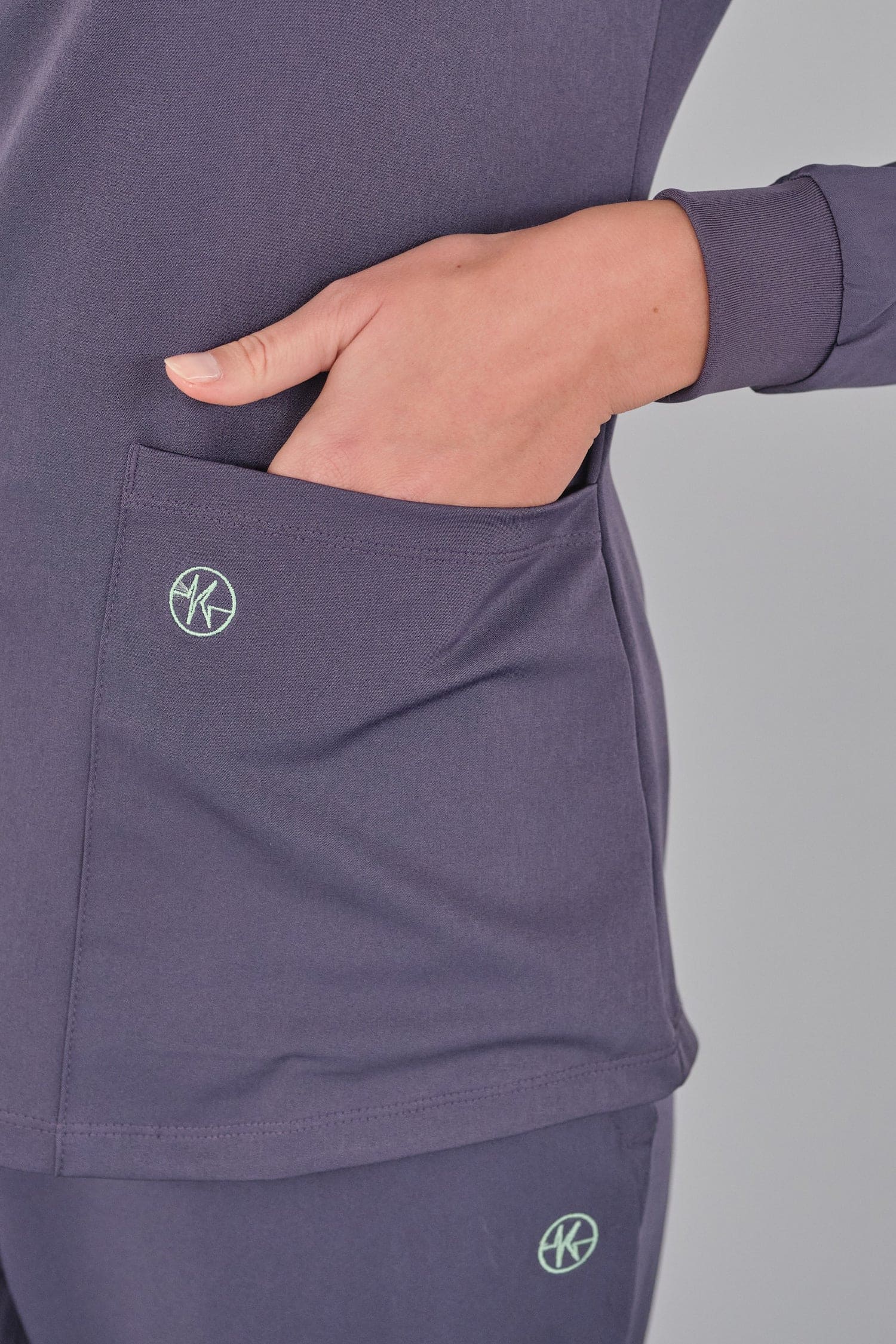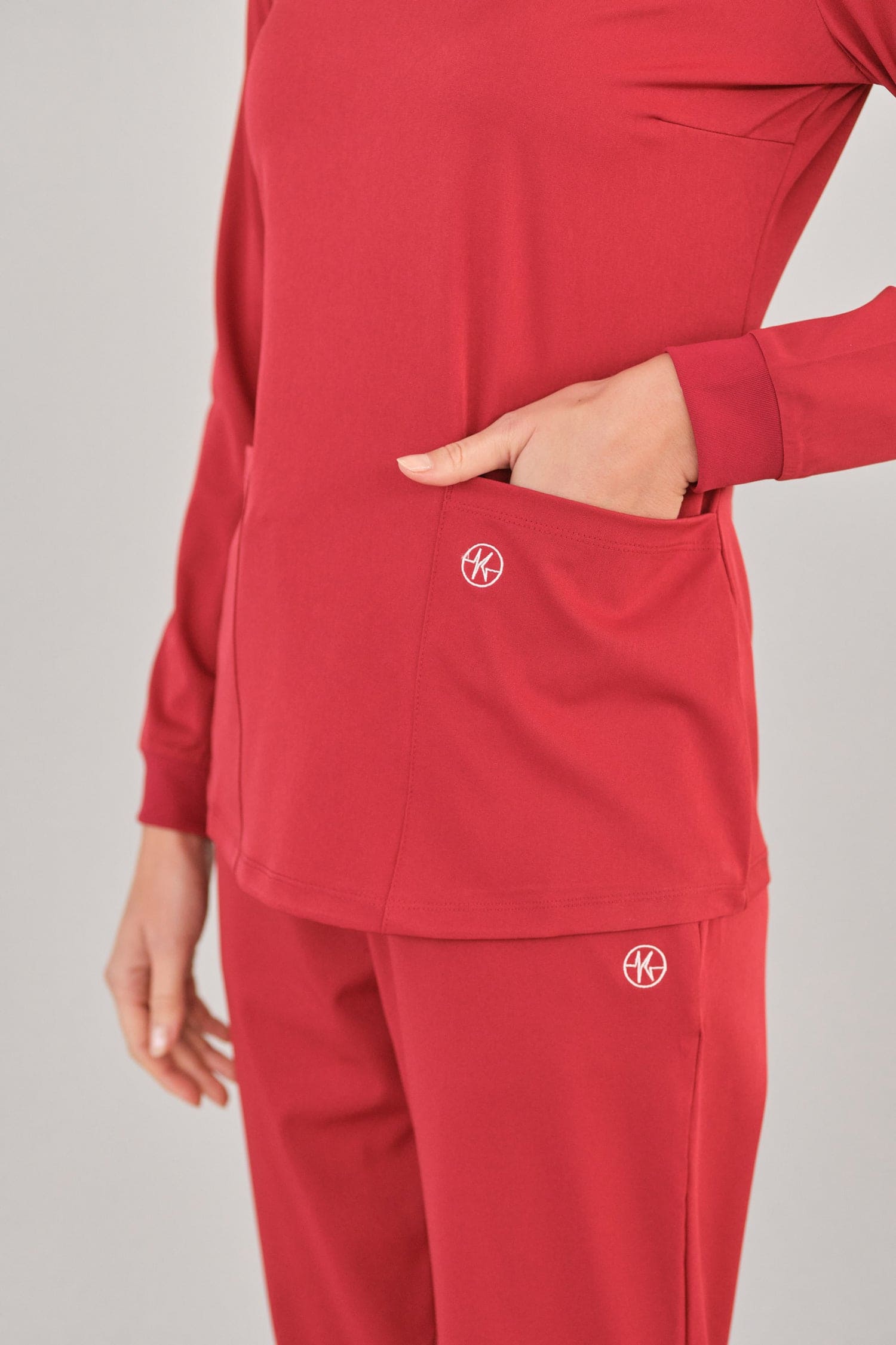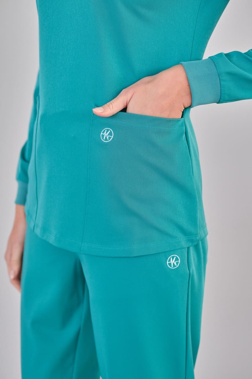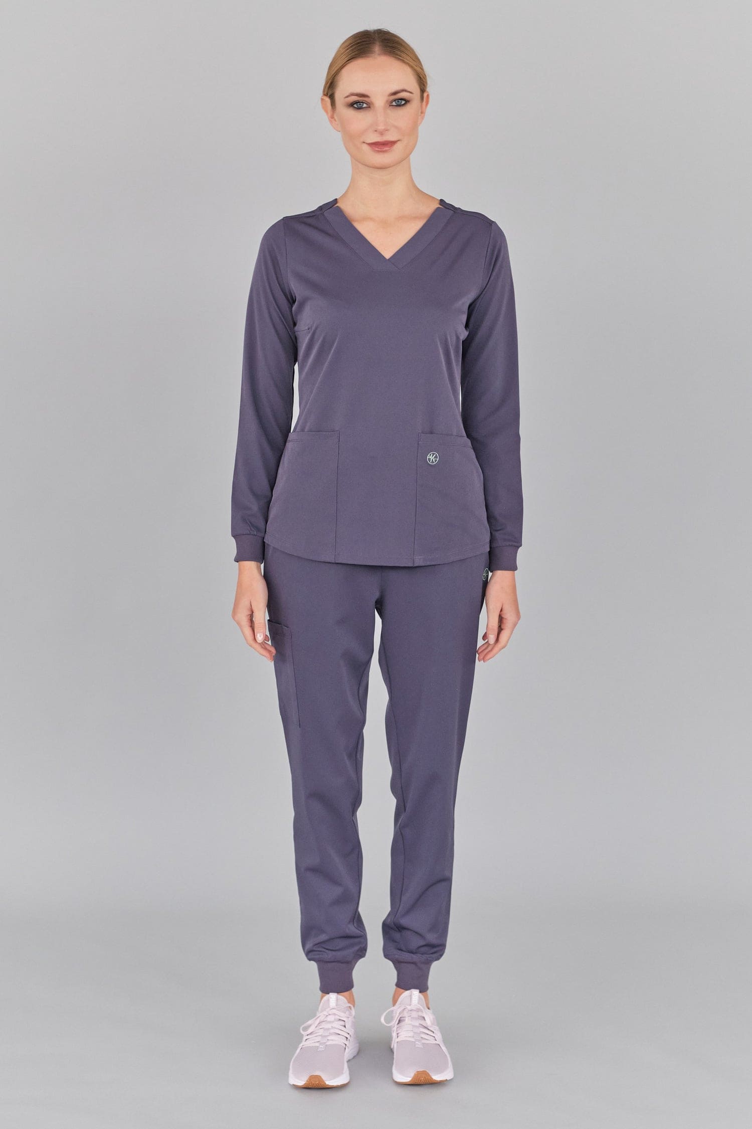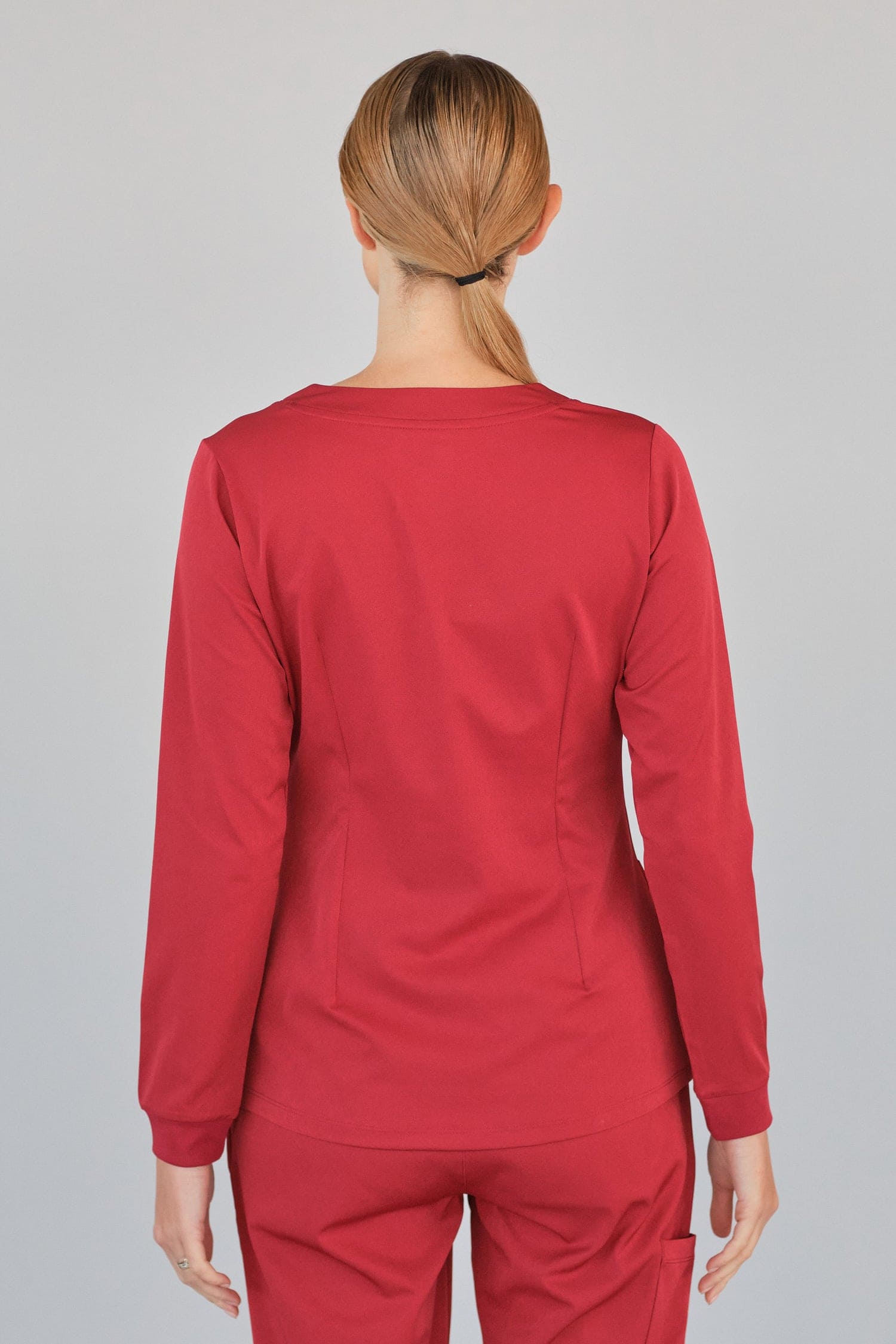 Langärmlige Damen-Tunika mit V-Ausschnitt aus Mikrofasergewebe, das klassischste unserer Modelle mit praktischen Taschen und einer engen, modernen Passform sowie praktischen Rippbündchen. Der weiche und elastische Stoff garantiert Bewegungsfreiheit und ein angenehmes Tragegefühl, während die Teflon®-Behandlung für wasserabweisenden und schmutzabweisenden Schutz sorgt
