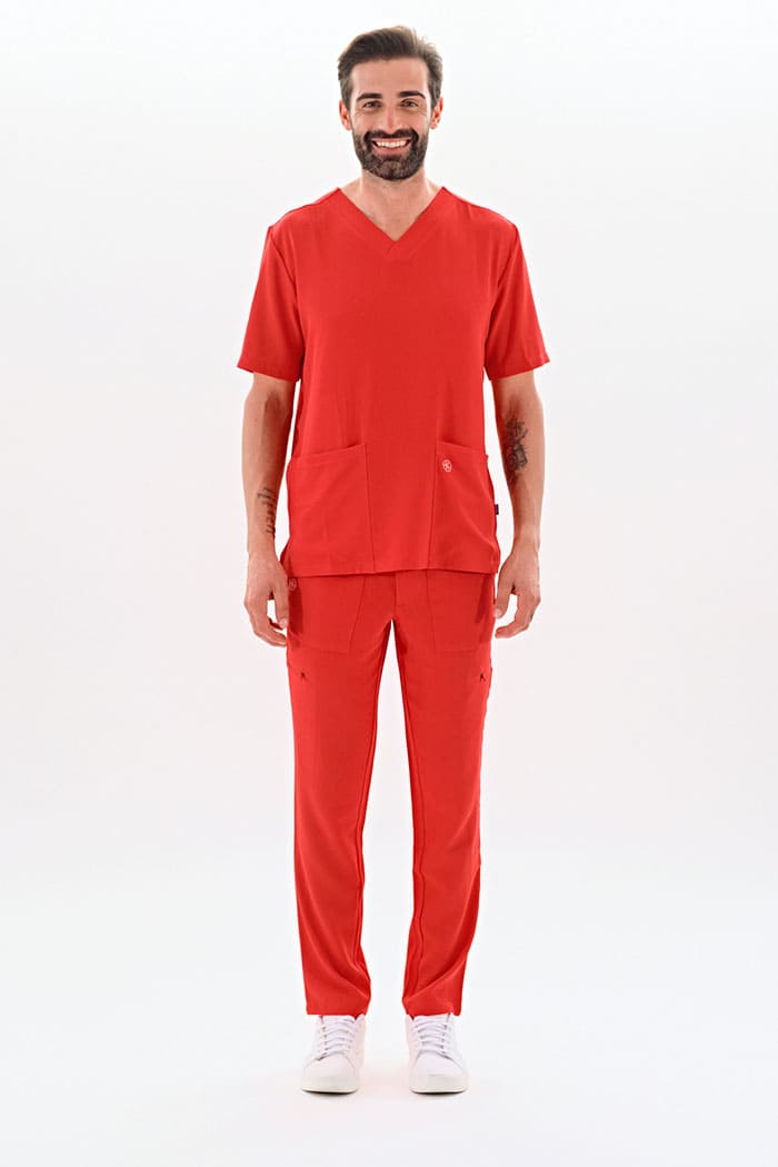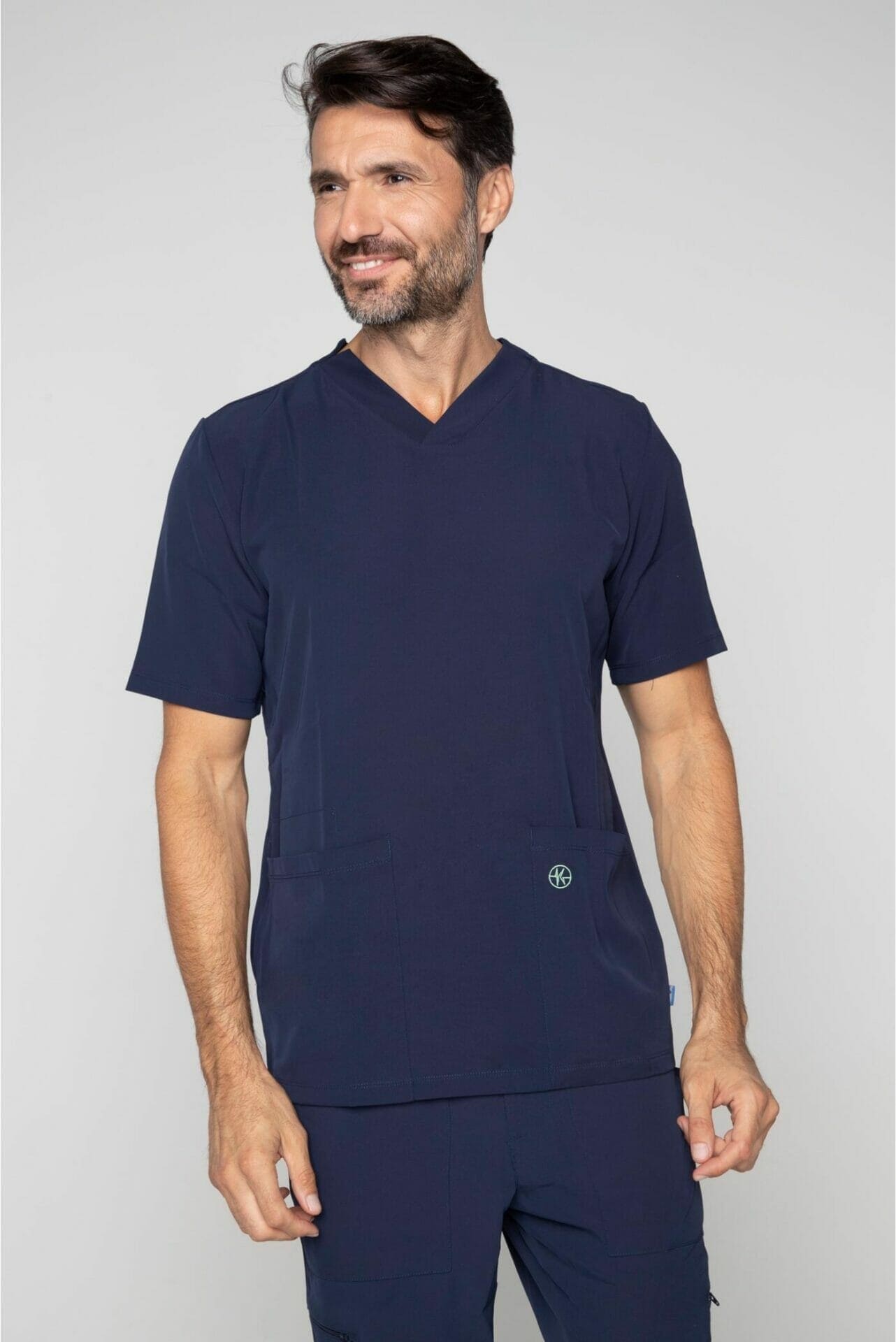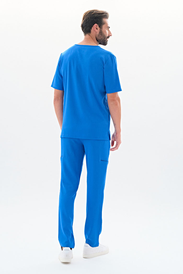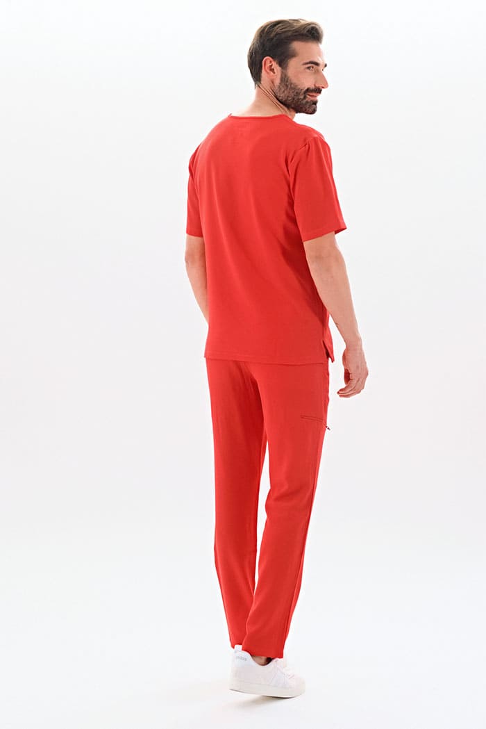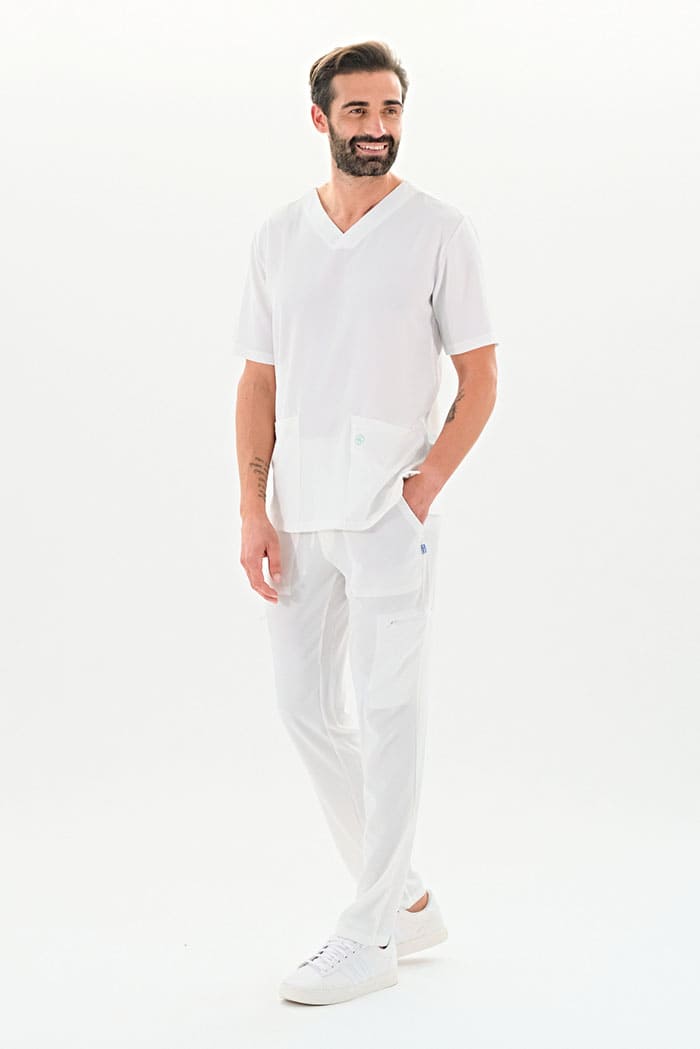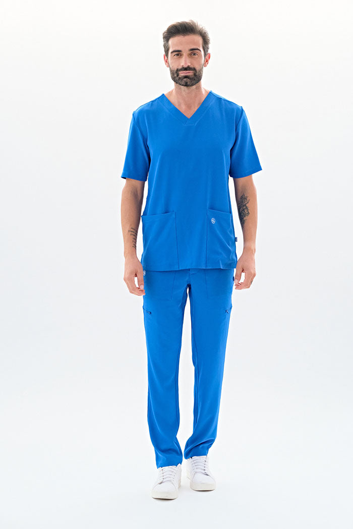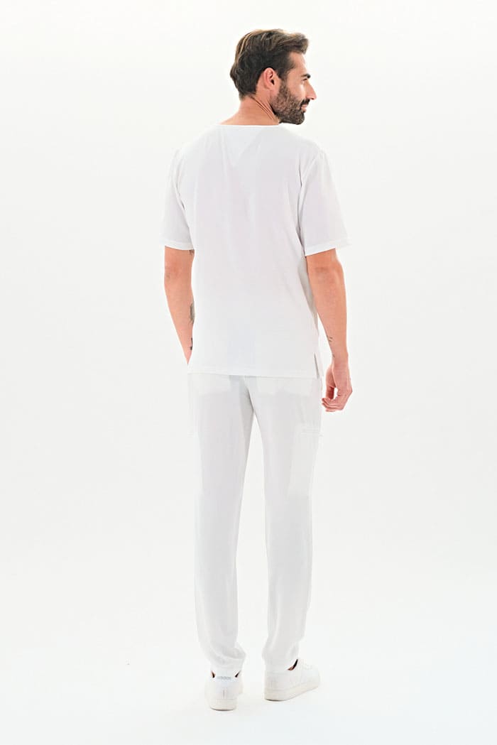 Kurzärmlige Herren-Tunika mit V-Ausschnitt aus innovativem 4-Wege-Stretch-Crêpe-Gewebe. Es ist unser Flaggschiff, das Komfort, Eleganz und Bewegungsfreiheit vereint. Der fließende, dehnbare und atmungsaktive Stoff garantiert maximalen Komfort.