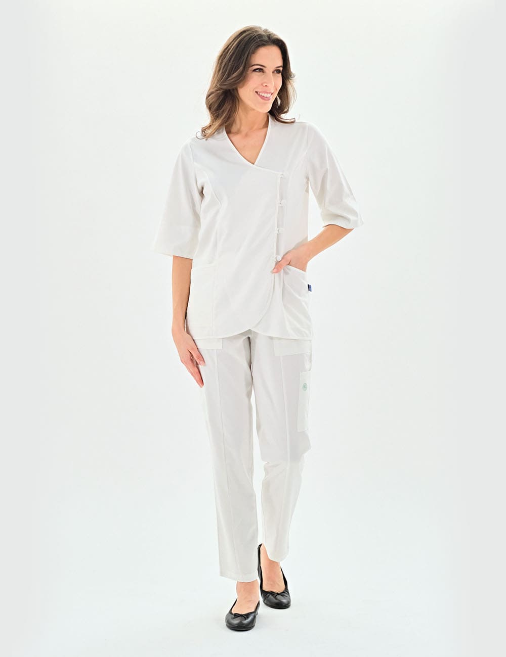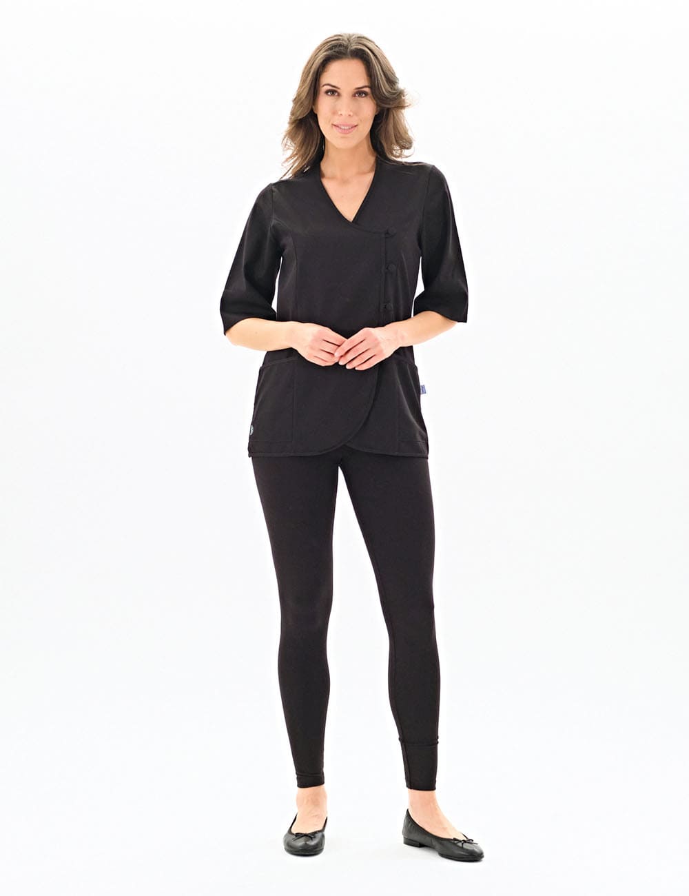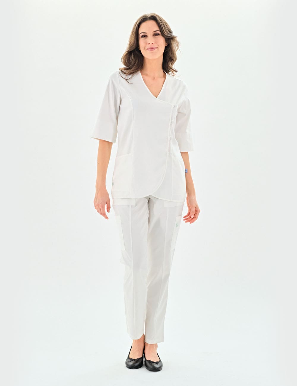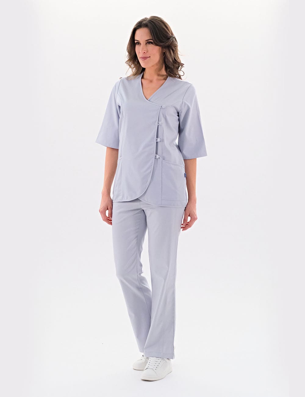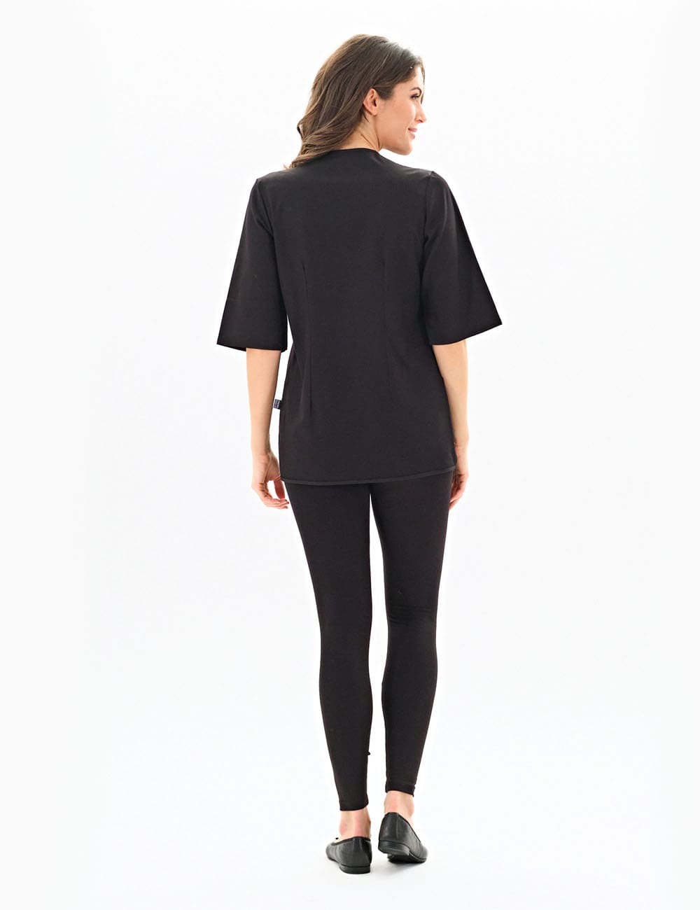 Asymmetrische Tunika mit Knöpfen aus weichem, leichtem Twill-Stoff. Es verfügt über elegante, verdeckte Knöpfe und die Möglichkeit, den Verschluss in der Taille dank der praktischen geknoteten Schnürsenkel an der Innenseite anzupassen. Die 3/4-Ärmel, die abgerundeten Linien und die konturierten Schnitte an der Brust sorgen für eine außergewöhnliche Funktionalität und eine harmonische und bestechende Passform