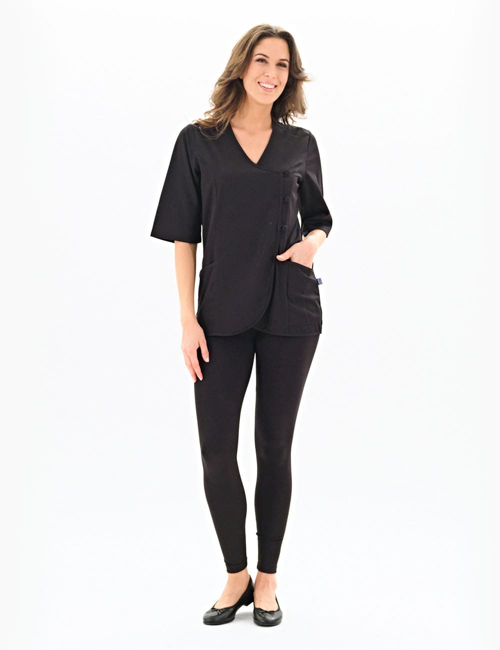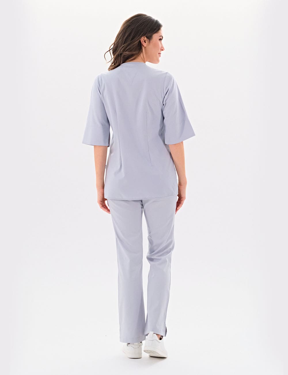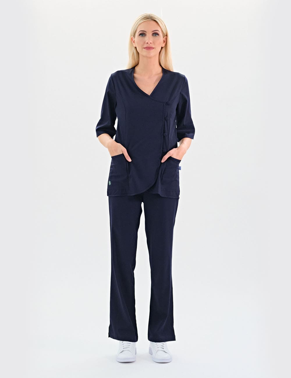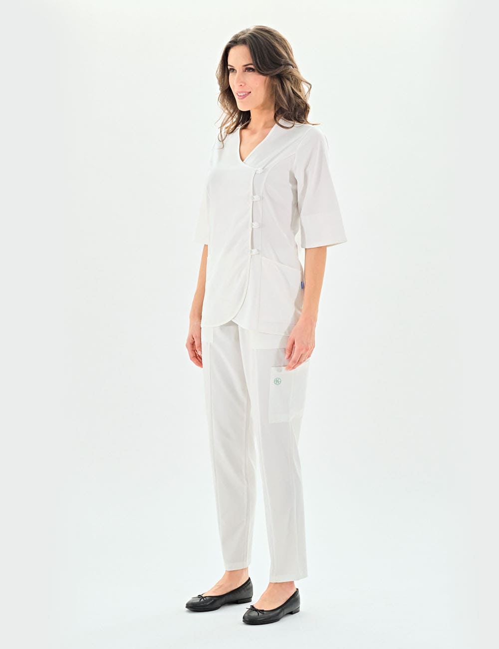 Asymmetrische Tunika mit Knöpfen aus weichem, leichtem Twill-Stoff. Es verfügt über elegante, verdeckte Knöpfe und die Möglichkeit, den Verschluss in der Taille dank der praktischen geknoteten Schnürsenkel an der Innenseite anzupassen. Die 3/4-Ärmel, die abgerundeten Linien und die konturierten Schnitte an der Brust sorgen für eine außergewöhnliche Funktionalität und eine harmonische und bestechende Passform