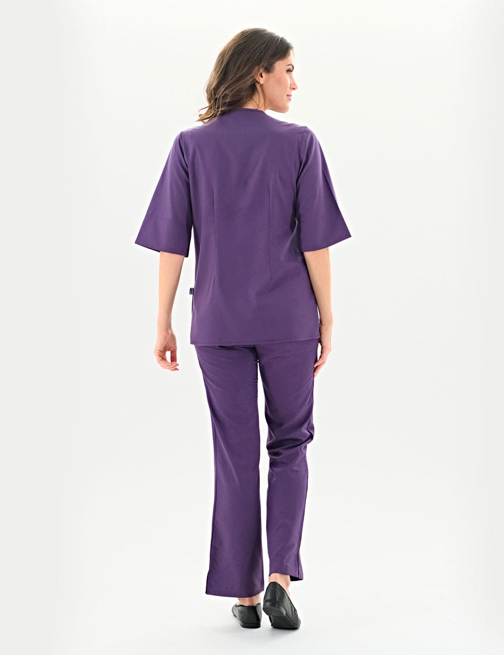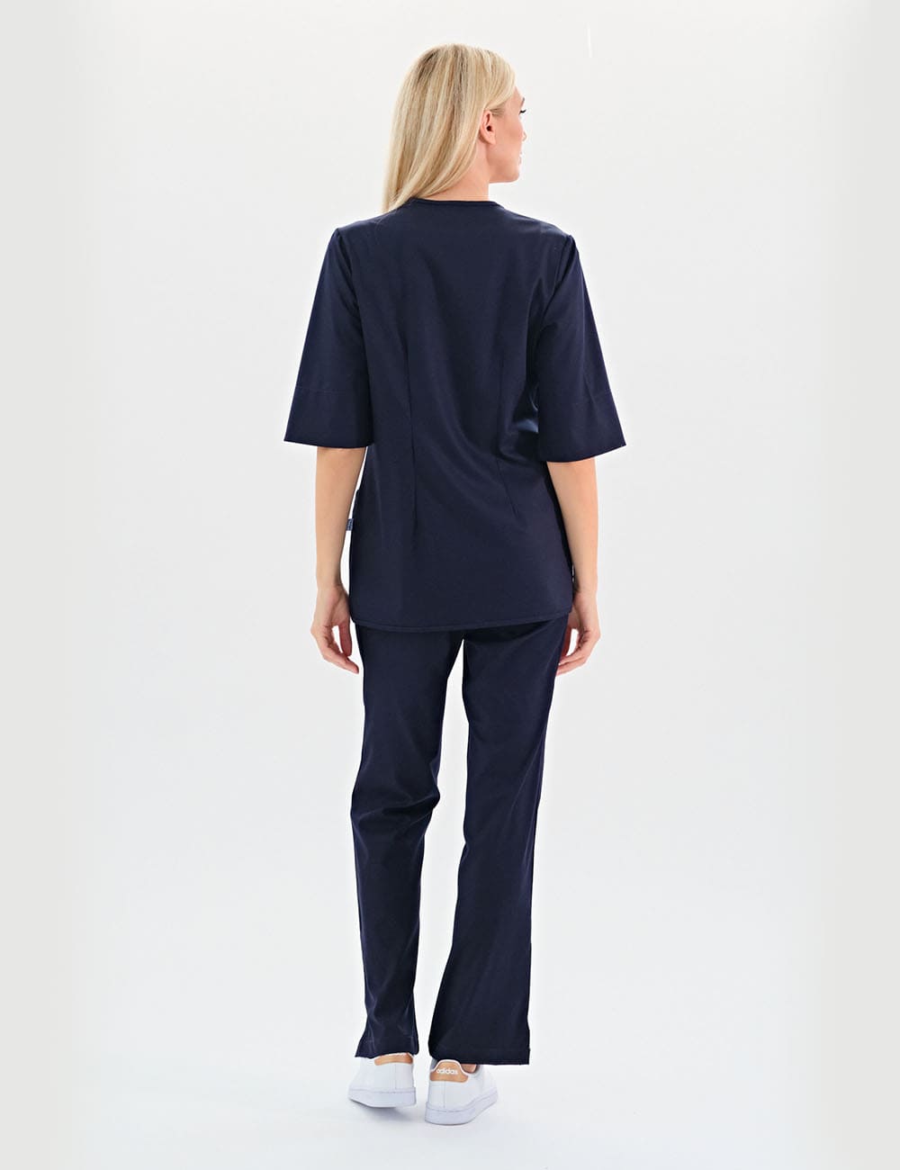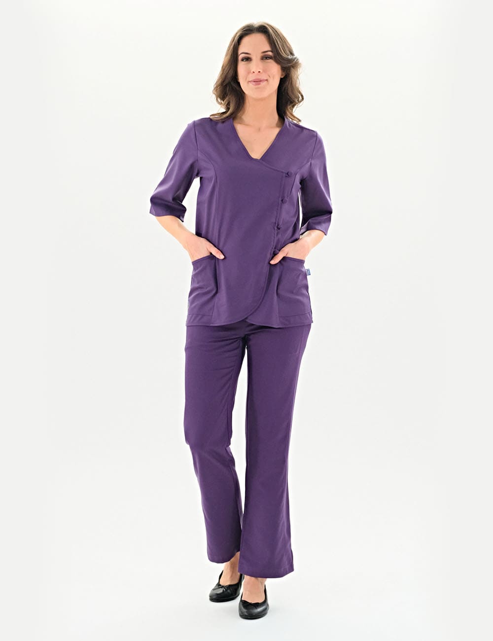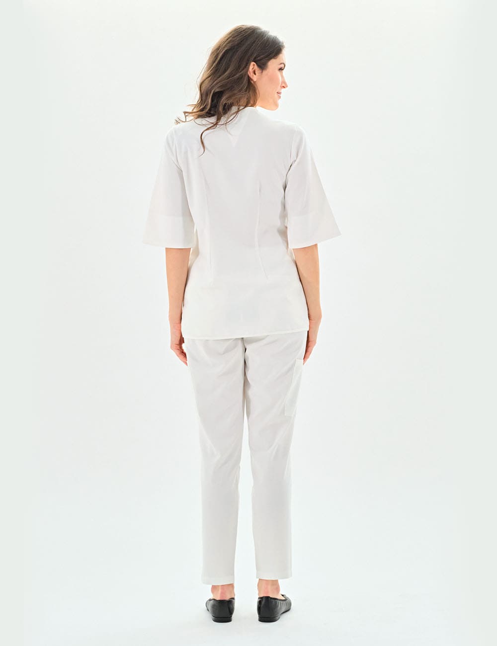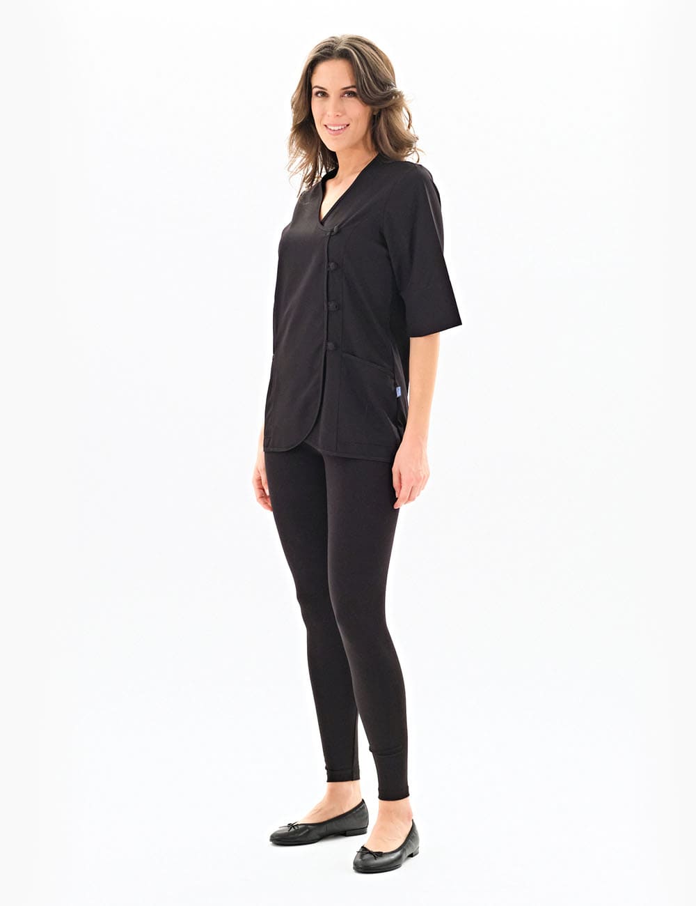 Asymmetrische Tunika mit Knöpfen aus weichem, leichtem Twill-Stoff. Es verfügt über elegante, verdeckte Knöpfe und die Möglichkeit, den Verschluss in der Taille dank der praktischen geknoteten Schnürsenkel an der Innenseite anzupassen. Die 3/4-Ärmel, die abgerundeten Linien und die konturierten Schnitte an der Brust sorgen für eine außergewöhnliche Funktionalität und eine harmonische und bestechende Passform
